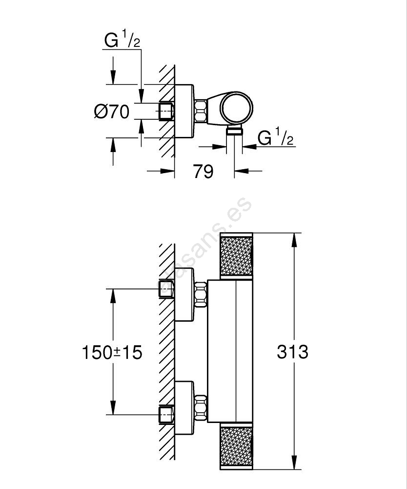 • Mezclador termostático de pared para ducha con un diseño elegante y esbelto.