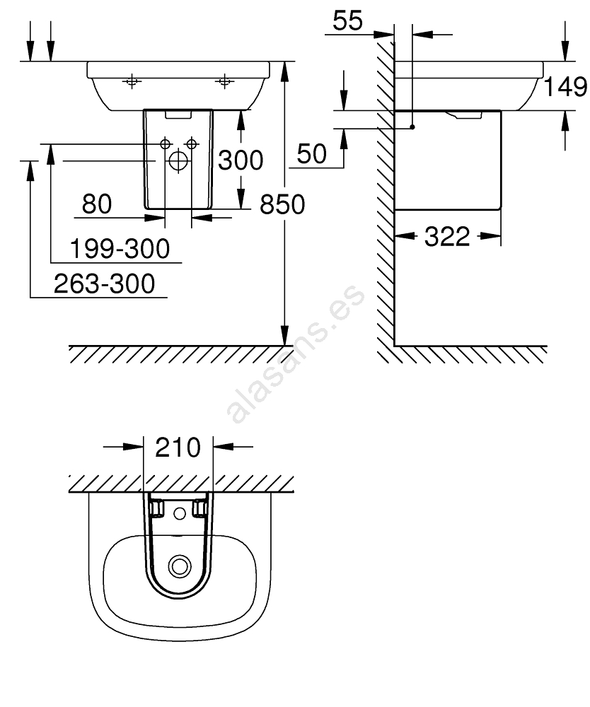 • Dimensiones: ancho 210 mm, profundidad 300 mm, altura 322 mm; apto para distintos tamaños de lavabo.