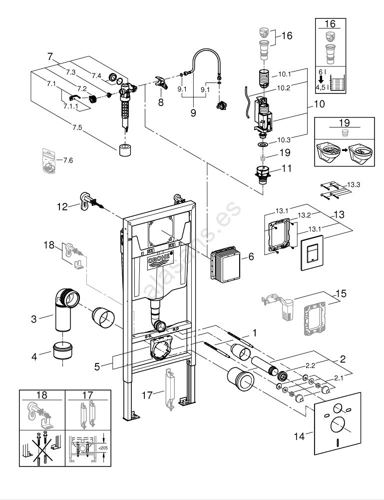• Juego de instalación completo 4 en 1 para inodoro suspendido con altura de 1,13 m.