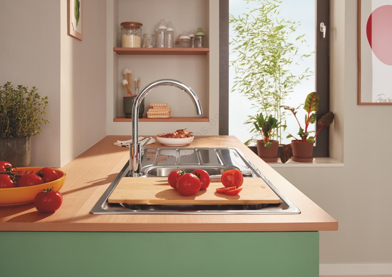 • Su diseño elegante complementa el aspecto de su cocina y combina con los fregaderos GROHE.