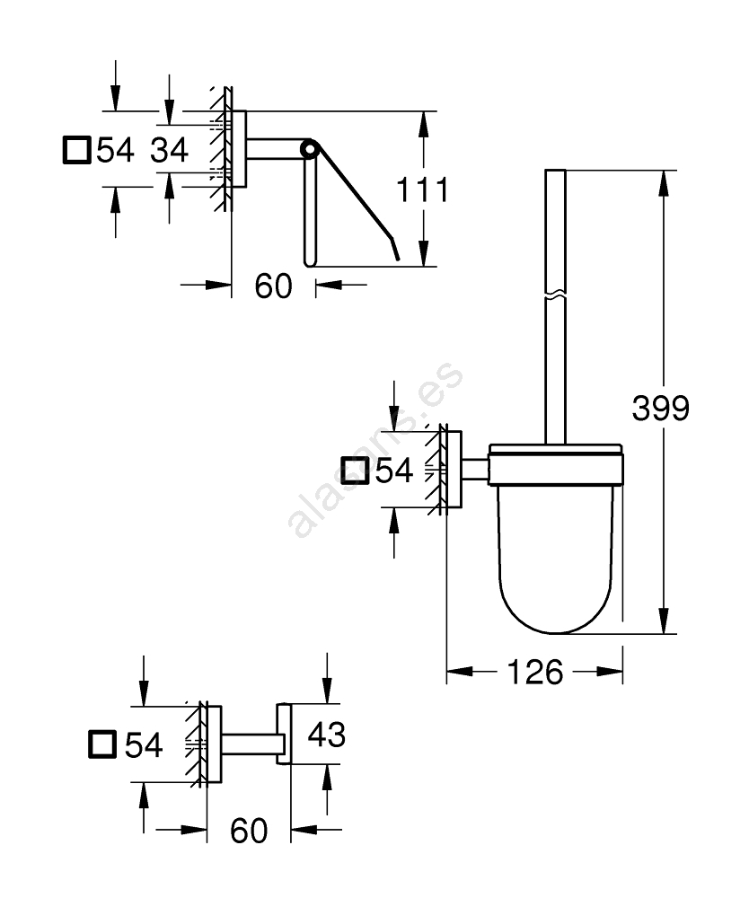 • El juego incluye gancho para albornoz, portarrollos y cepillo de inodoro.