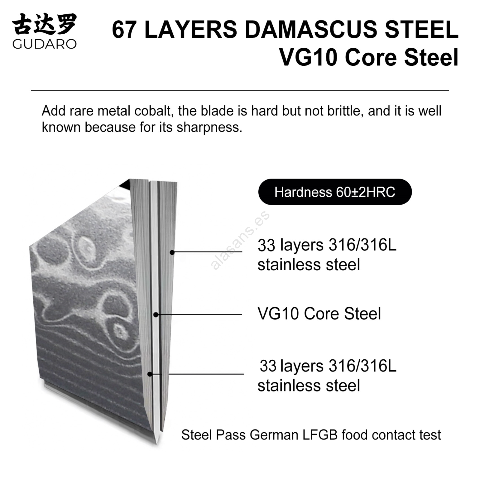 • La hoja de 125 mm y 67 capas de acero damasco con núcleo de VG10 destaca por su excepcional filo y resistencia al desgaste.