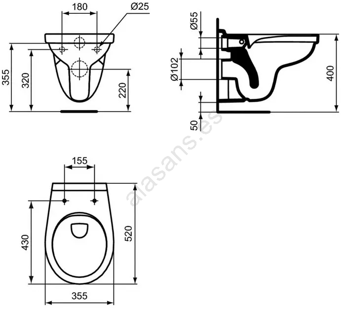 • Las dimensiones 355 x 520 mm y el desagüe horizontal facilitan la instalación en módulos empotrados compatibles.
