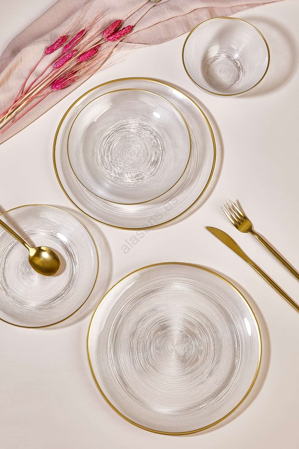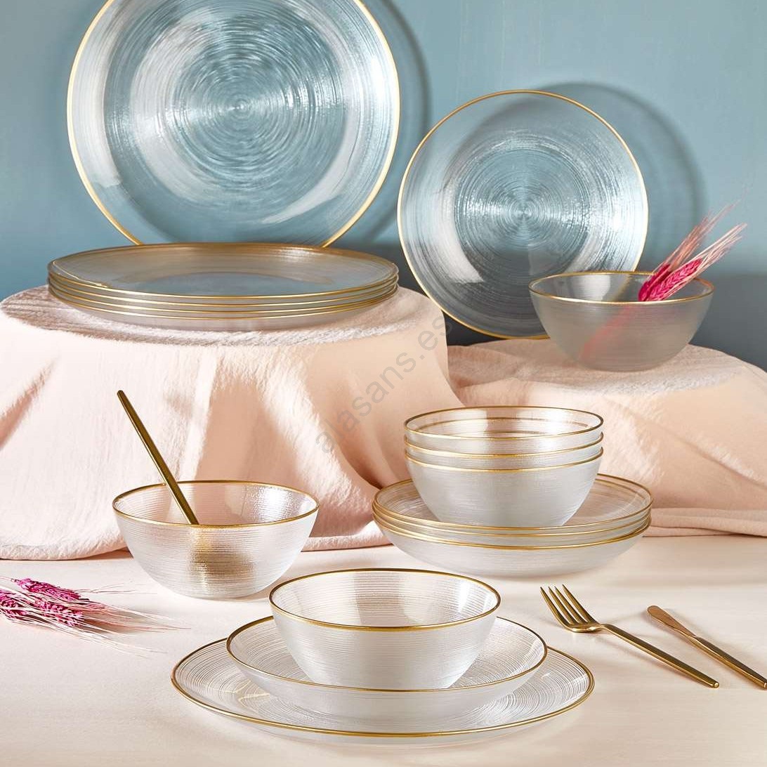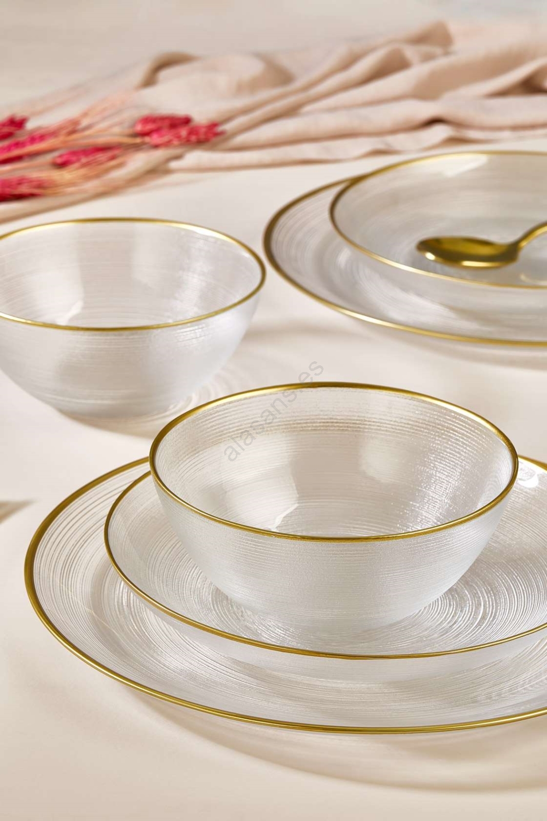 Juego de comedor de 18 piezas, vidrio transparente con acabado dorado