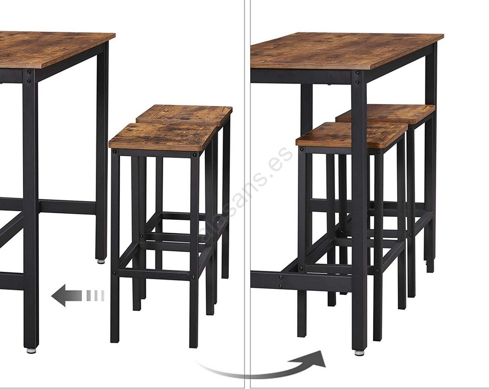 • Incluye también dos taburetes de bar con medidas 30x40x65 cm.