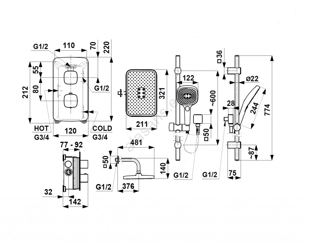 • El paquete incluye: caja empotrada, grifería completa, brazo de ducha, cabezal de ducha con manguera, ducha deslizante empotrada.