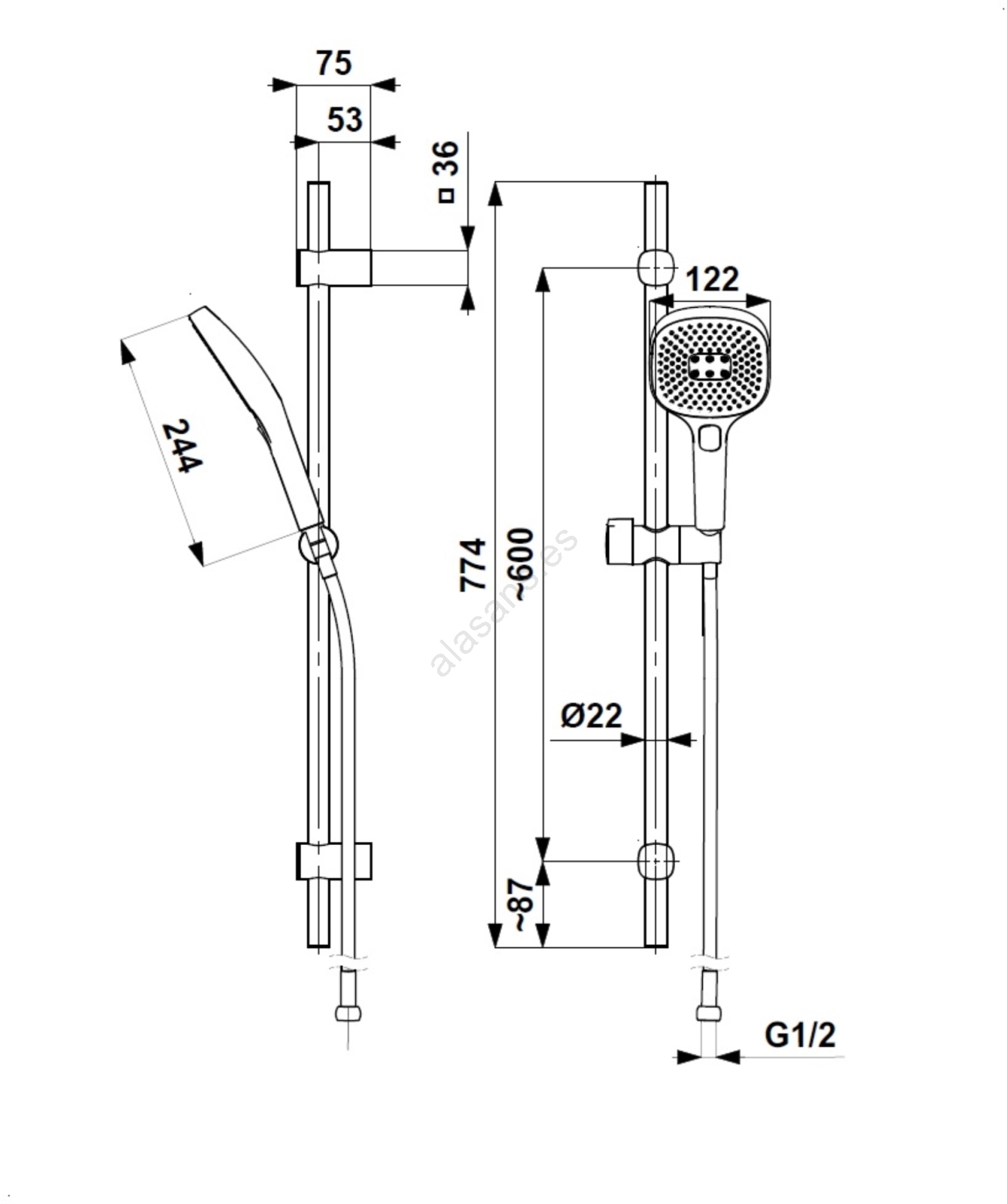 • El paquete incluye: barra de ducha, soportes de pared - 2 unidades (incluye 1 soporte ajustable para adaptar la posición a orificios existentes), juego de montaje (2 tornillos con tacos), ducha de mano con mango, manguera de PVC (L=1500 mm).