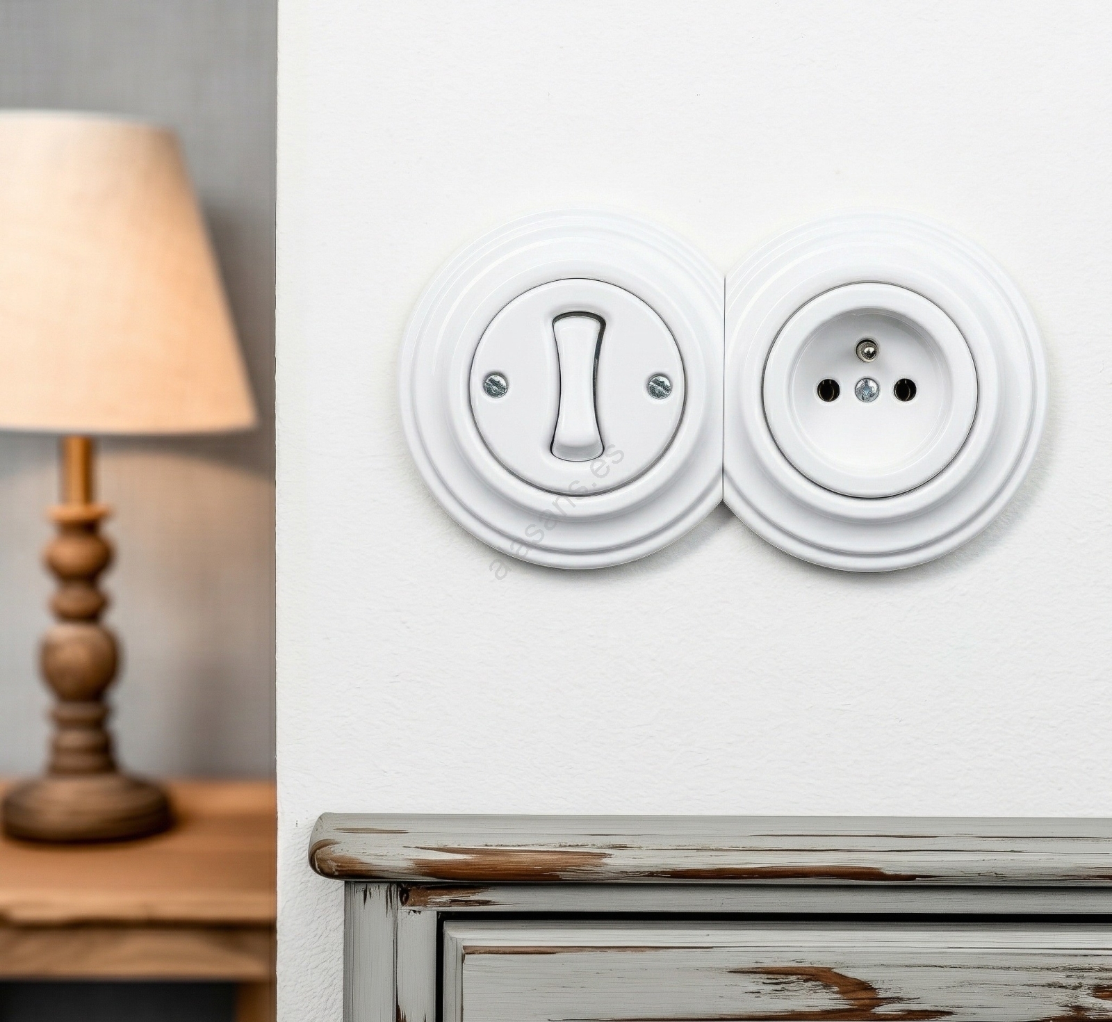 • Kliklap - Retro interruptor unipolar n.º 1 y toma de corriente 230 V con marco, cerámica blanca