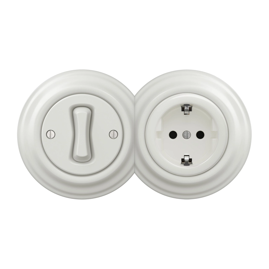 Kliklap - Interruptor unipolar retro n.º 1 y enchufe SCHUKO 230 V con marco cerámico blanco