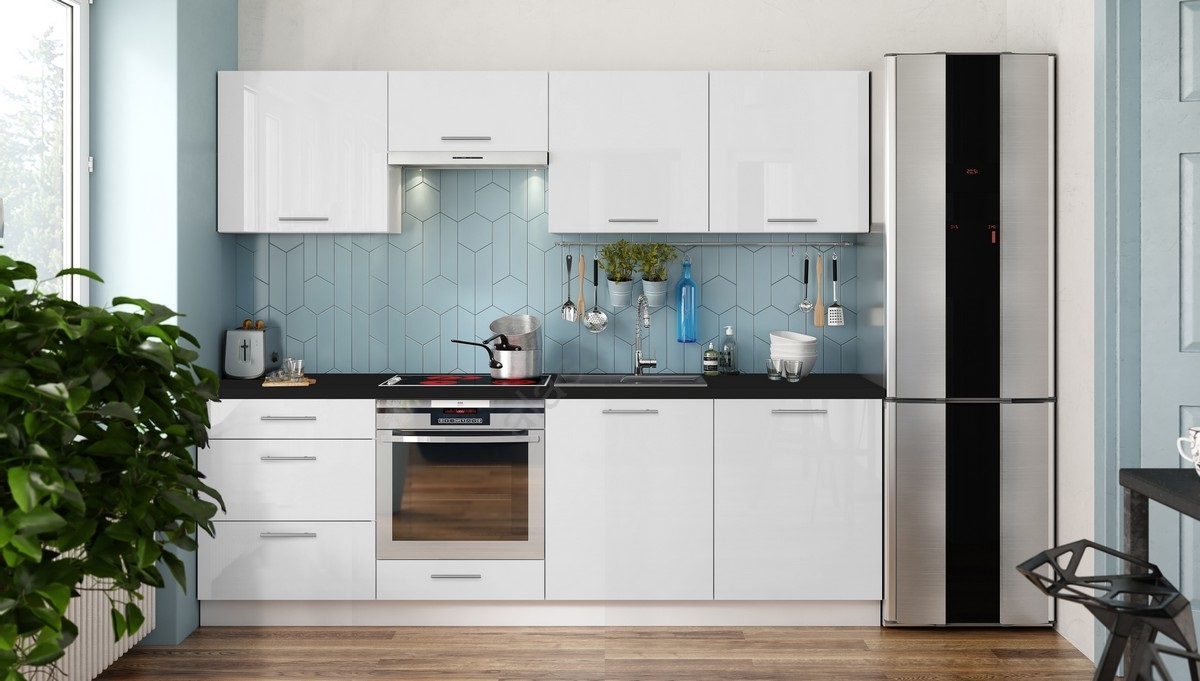 • Mueble de cocina CELESTE de 240 cm, blanco lacado brillante