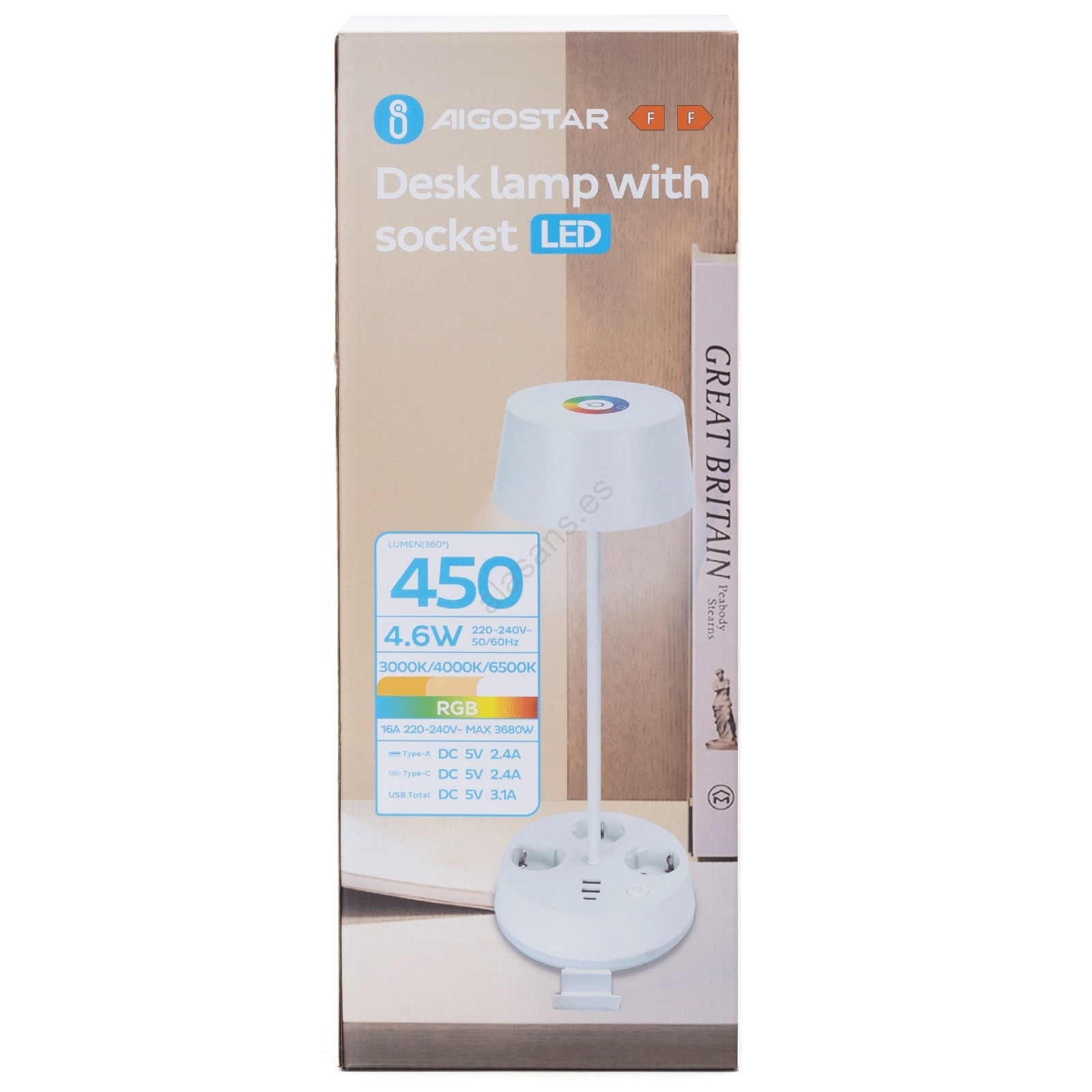 Aigostar - Lámpara de mesa LED RGBW regulable con enchufes y USB LED/4,6W/230V 3000/4000/6500K blanca