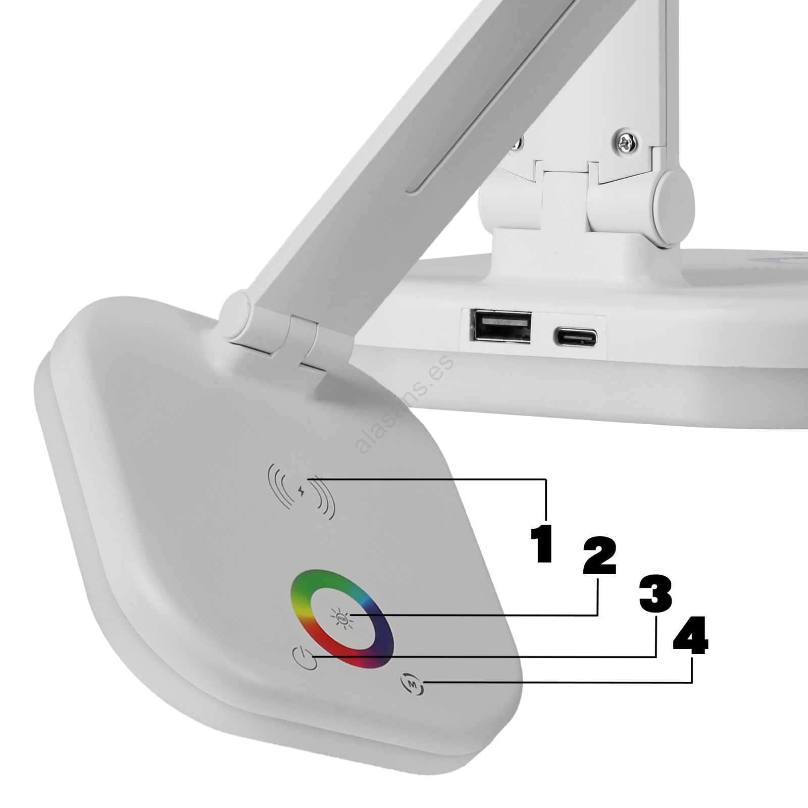 • Lámpara de sobremesa LED RGBW regulable con carga inalámbrica LED/7W/5V USB blanca