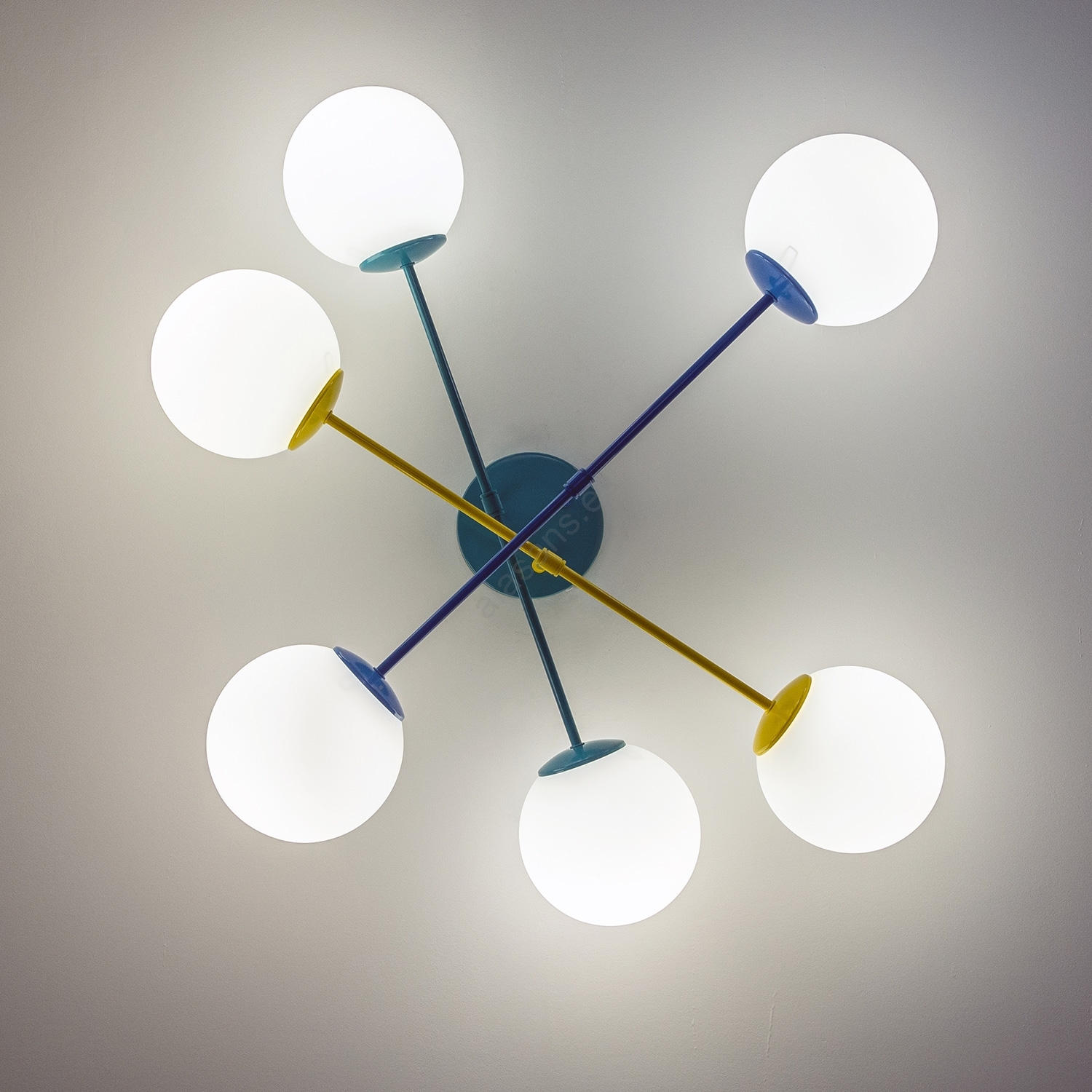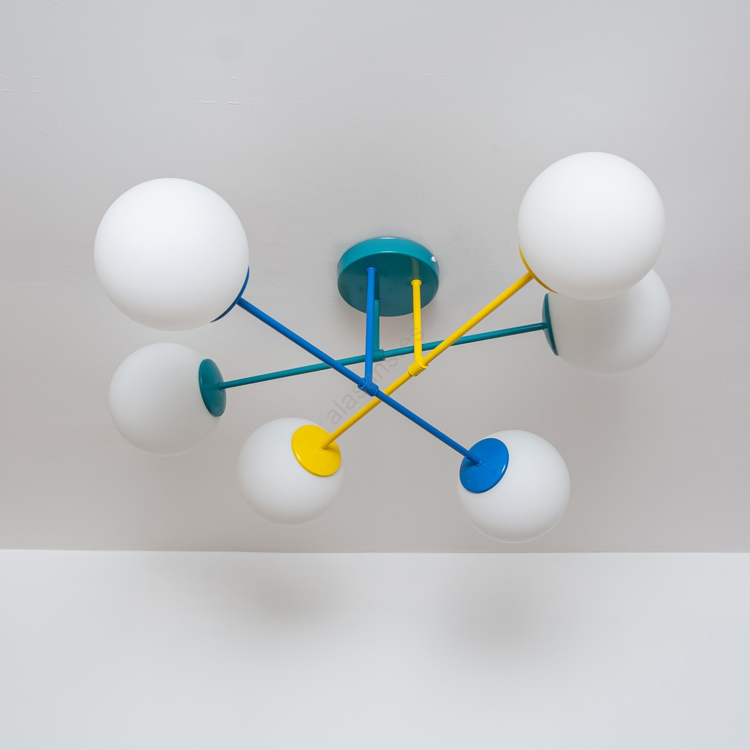 El diseño bonito y funcional caracteriza a Lámpara de techo de superficie MOON 6xE27/15W/230V turquesa/amarillo/azul.  Una bombilla con casquillo E27 es adecuada para la lámpara. Aquí, puedes comprar otras bombillas a precios ventajosos. Será una adición interesante para tu hogar.
