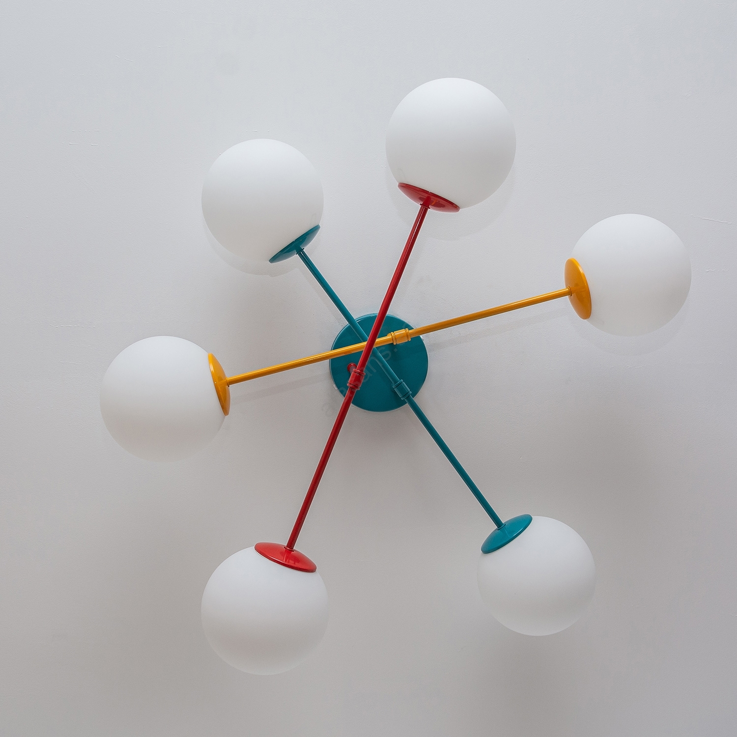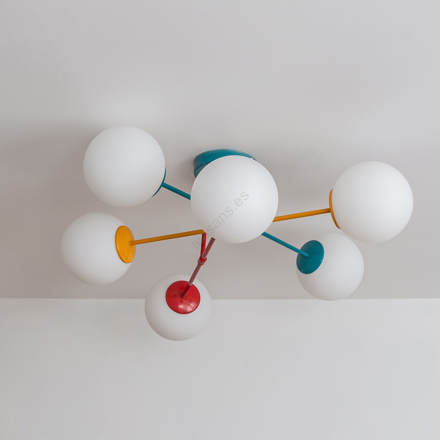 El diseño bonito y funcional caracteriza a Lámpara de techo de superficie MOON 6xE27/15W/230V turquesa/amarillo/rojo.  Una bombilla con casquillo E27 es adecuada para la lámpara. Aquí, puedes comprar otras bombillas a precios ventajosos. Será una adición interesante para tu hogar.