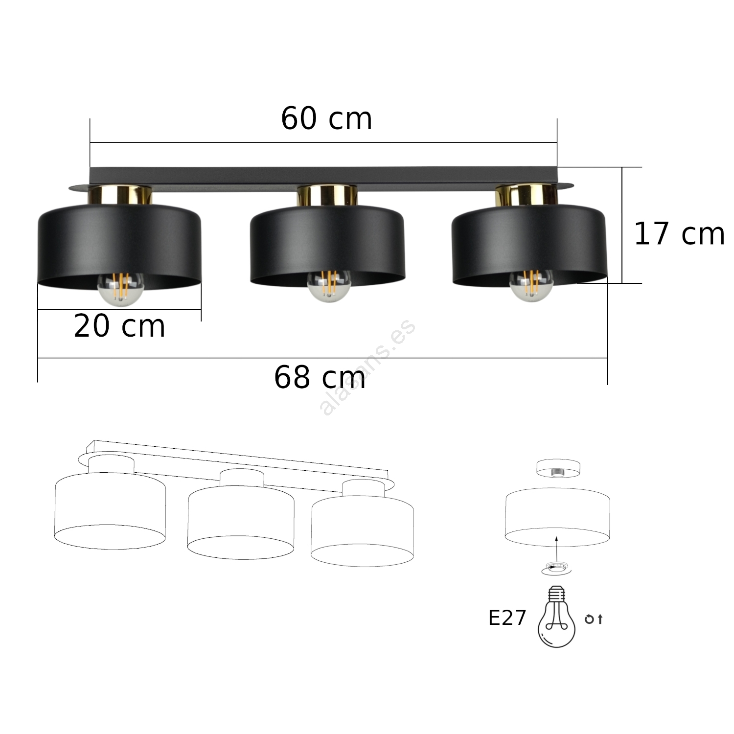 El diseño bonito y funcional caracteriza a Lámpara de techo IGNIA 3xE27/60W/230V negro/dorado.  Una bombilla con casquillo E27 es adecuada para la lámpara. Aquí, puedes comprar otras bombillas a precios ventajosos. Será una adición interesante para tu hogar.