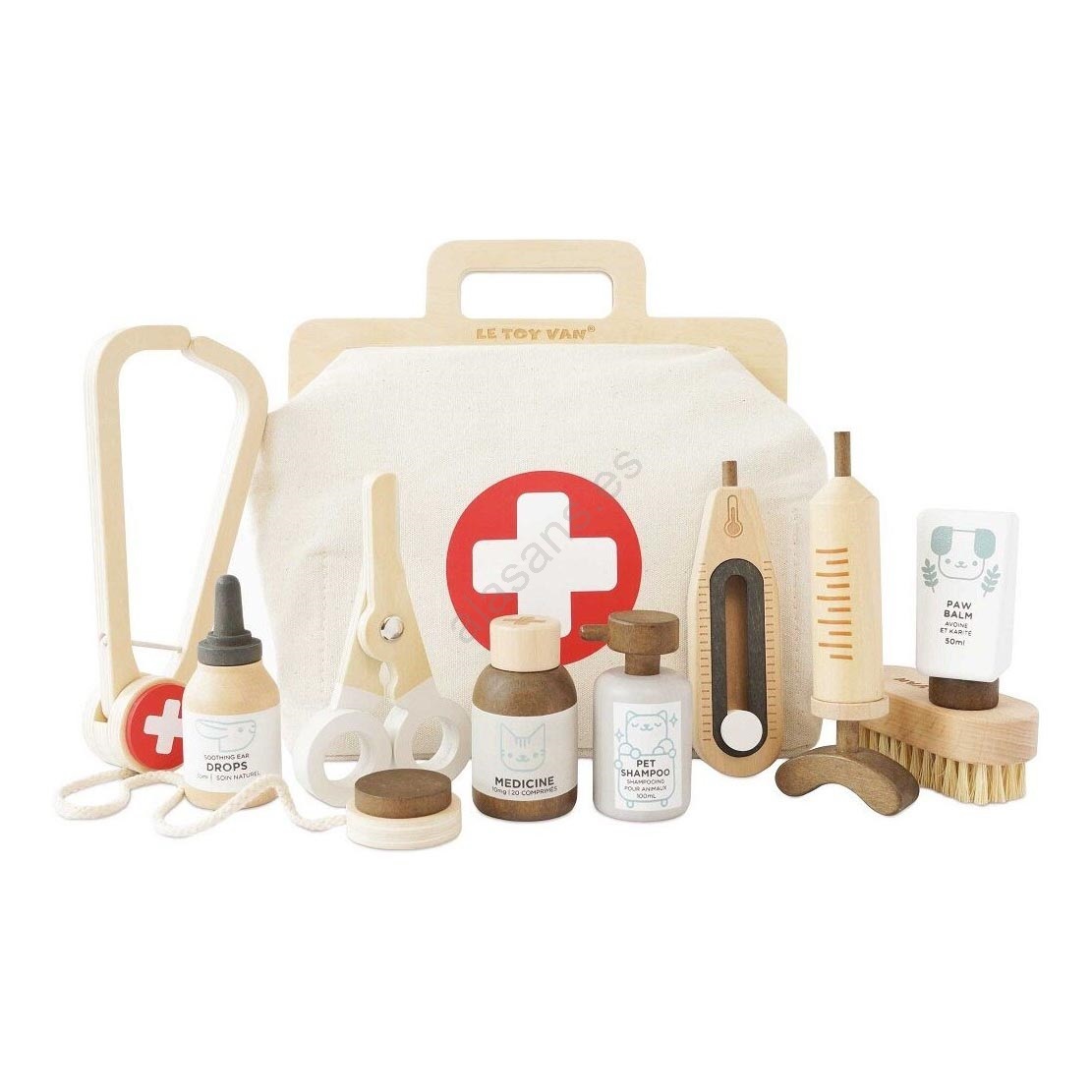 • En el bolso encontrará bálsamo calmante para patas, gotas para los oídos, caja para medicamentos, champú para mascotas, estetoscopio, tijeras, jeringa e cepillo suave con cerdas ecológicas.