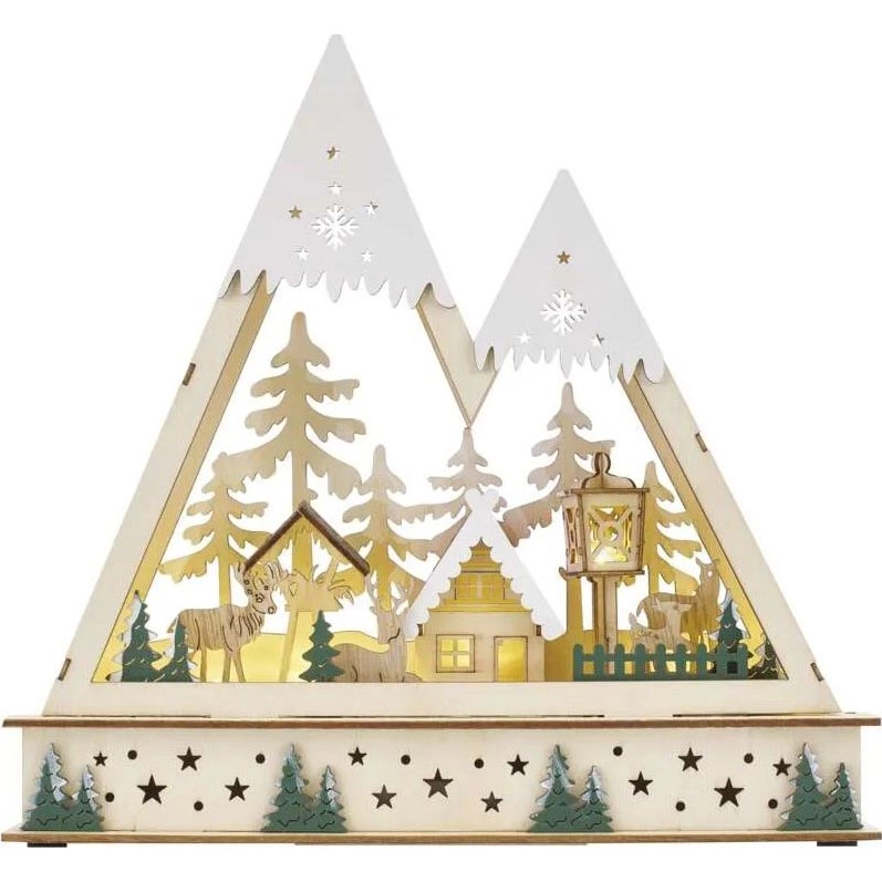 • Decoración tallada con motivos de montañas nevadas y elementos forestales; el complemento perfecto para su decoración festiva de Adviento.