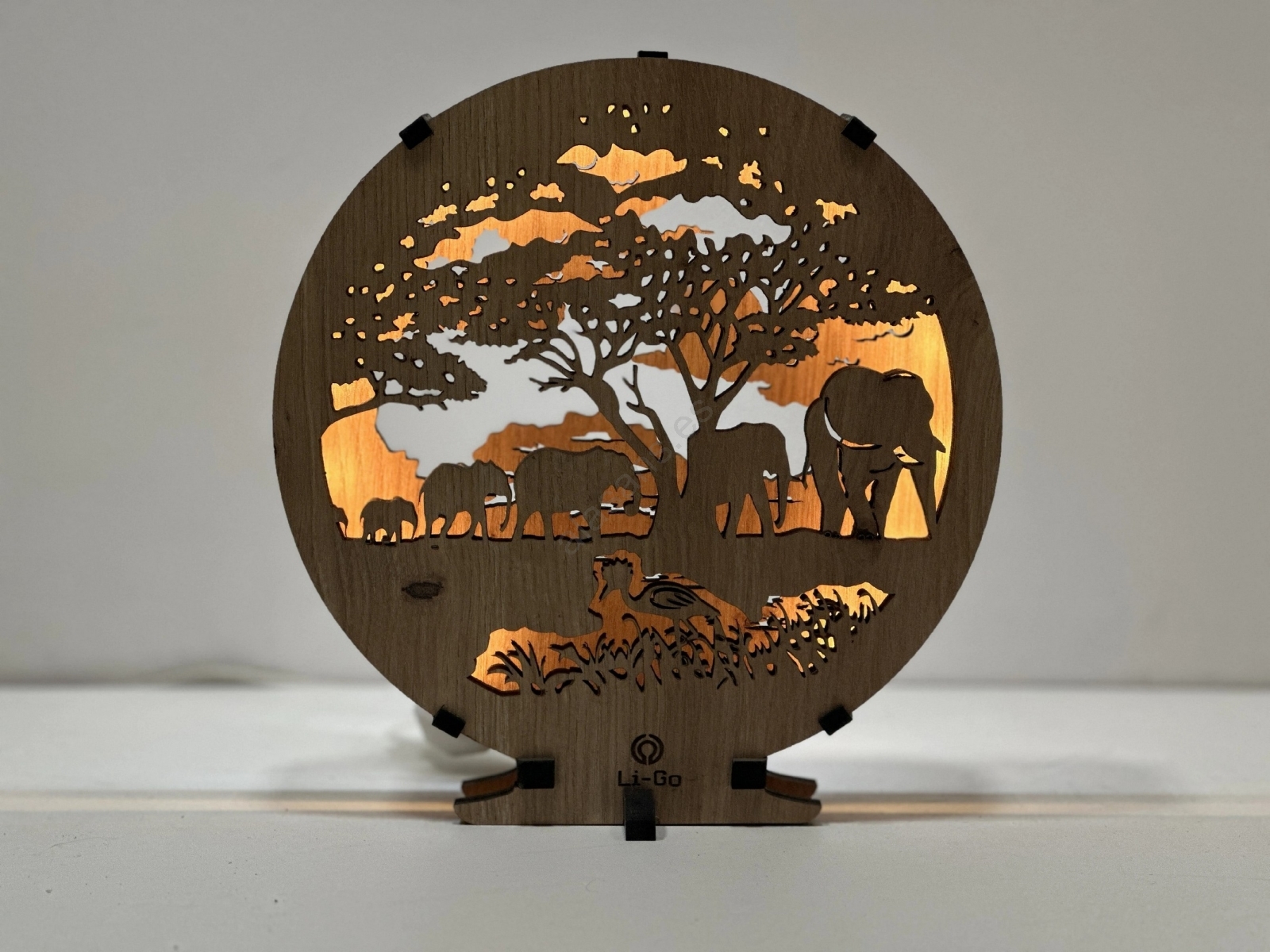 Li-Go 23610/DUB2 - Lámpara decorativa de sobremesa LED regulable, LED/12W/230V, 20x22 cm, acabado roble con motivos de elefantes