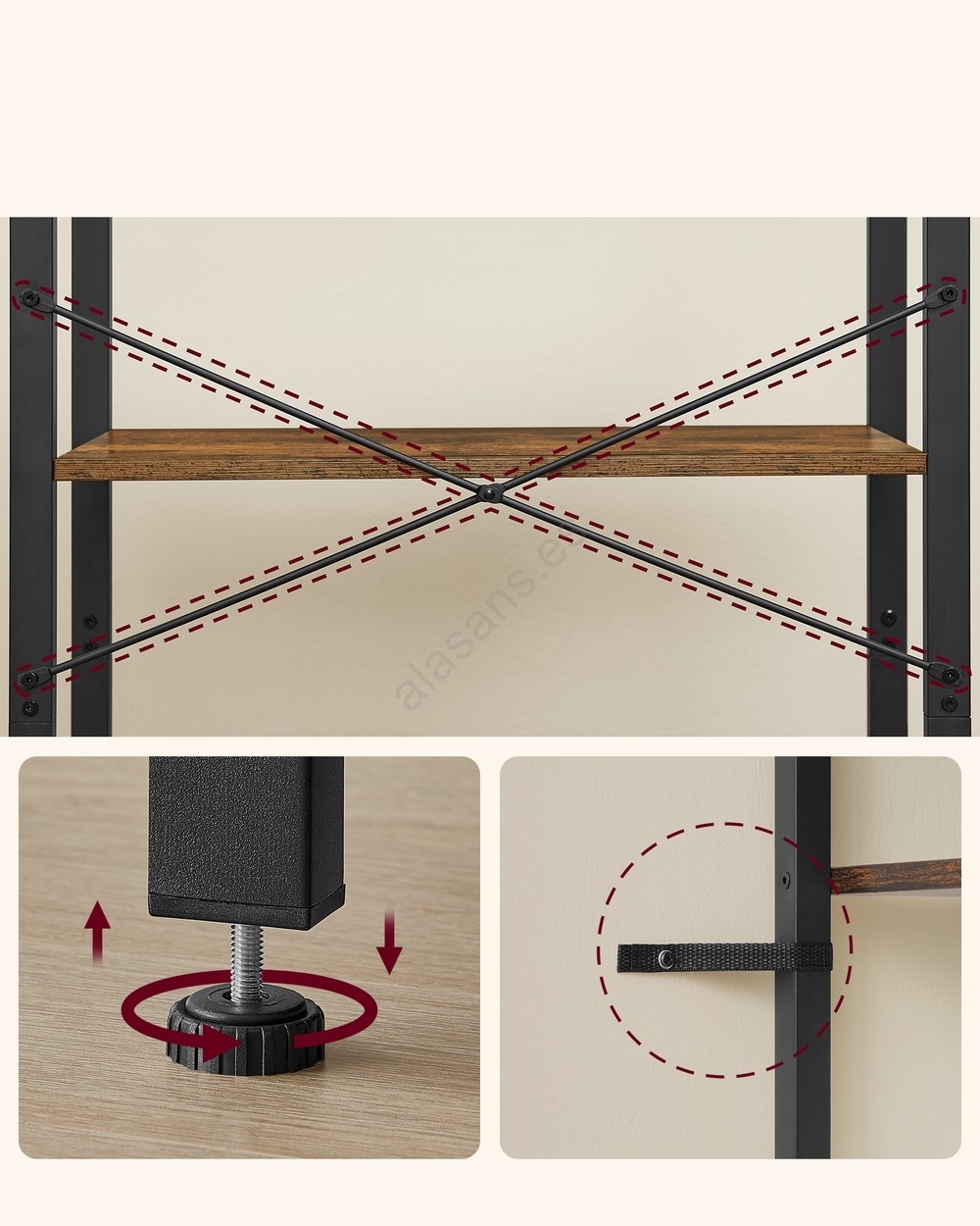 • El kit antivuelco incluido le permite fijar la estantería a la pared para aumentar su estabilidad y mantenerla segura.