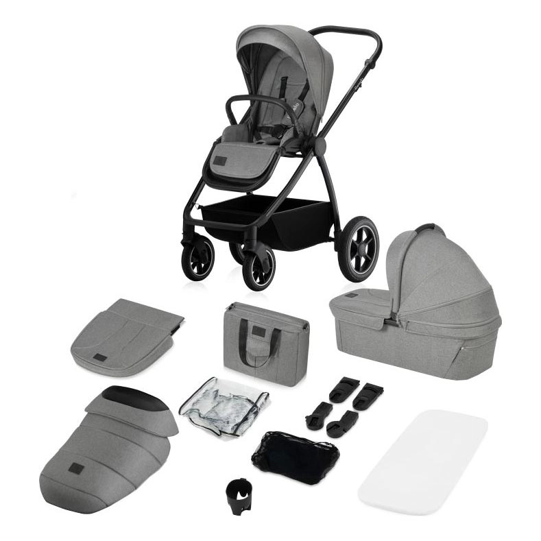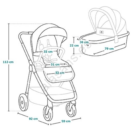 • Set de accesorios: cubrepiernas, mosquitera, funda para capazo, cobertor para lluvia, bolso para padres, portavasos, cesta con cierre.