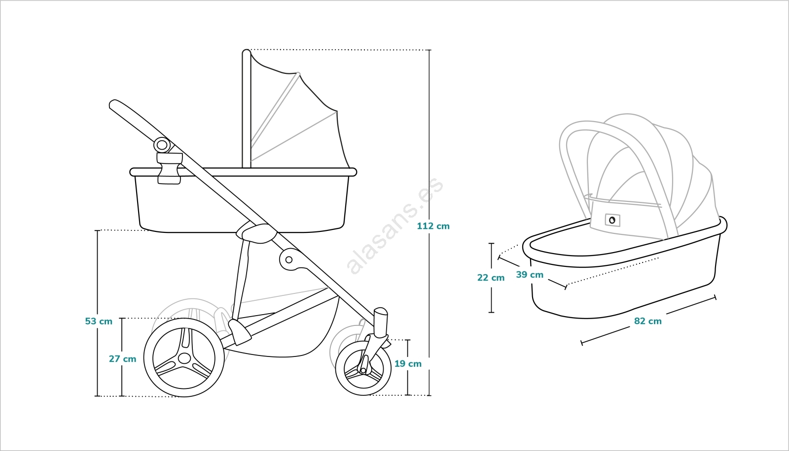 • Cochecito 2 en 1 – capazo y versión deportiva, desde el nacimiento hasta aprox. 4 años (capazo hasta 9 kg, silla de paseo hasta 22 kg).