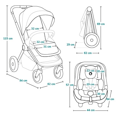 • Completo set de accesorios: funda para lluvia, mosquitera, visor solar, cubre piernas 2 en 1, portavasos, bolso, adaptadores.