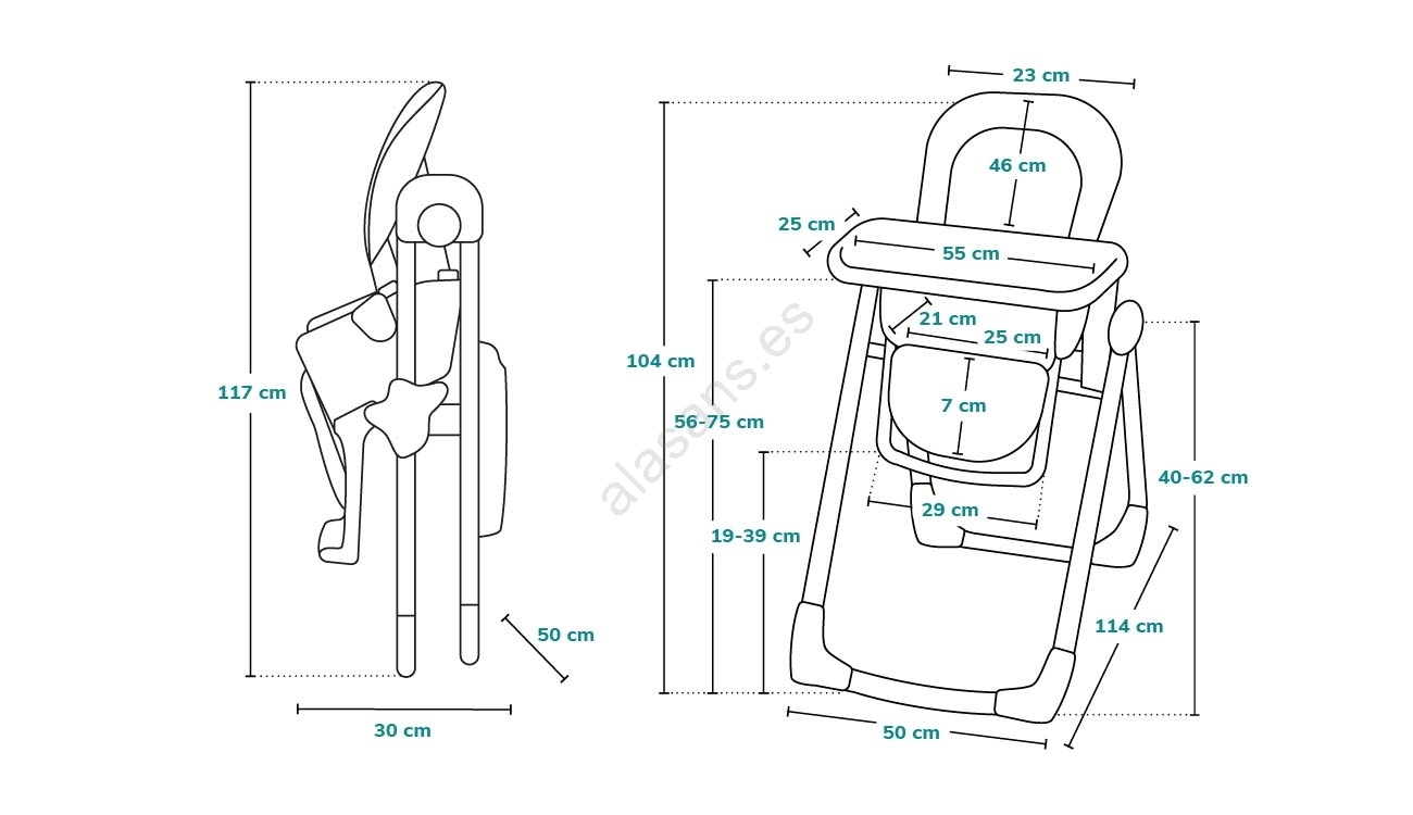 • Amplias opciones de ajuste permiten adaptar la trona a cualquier mesa.