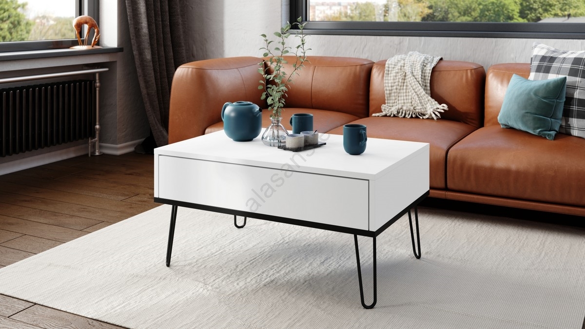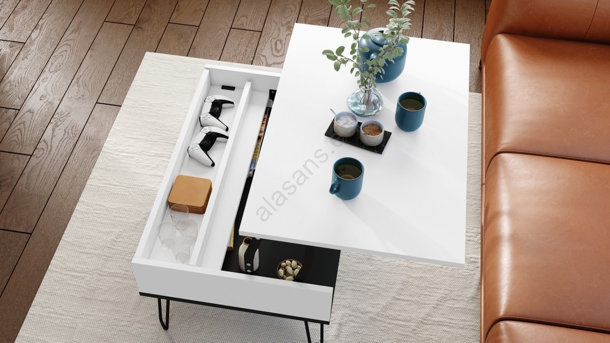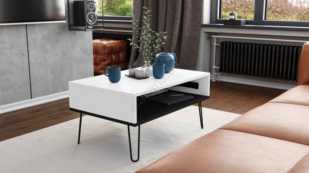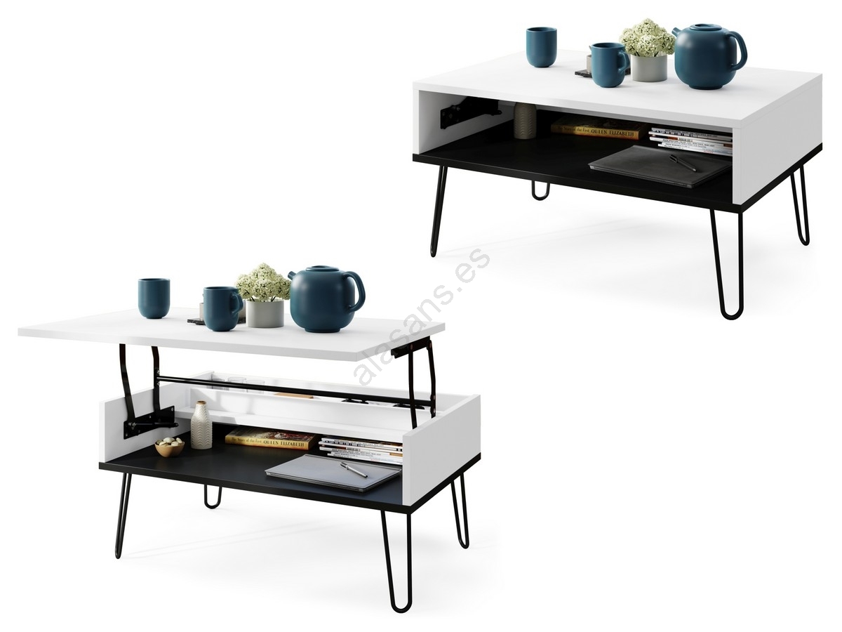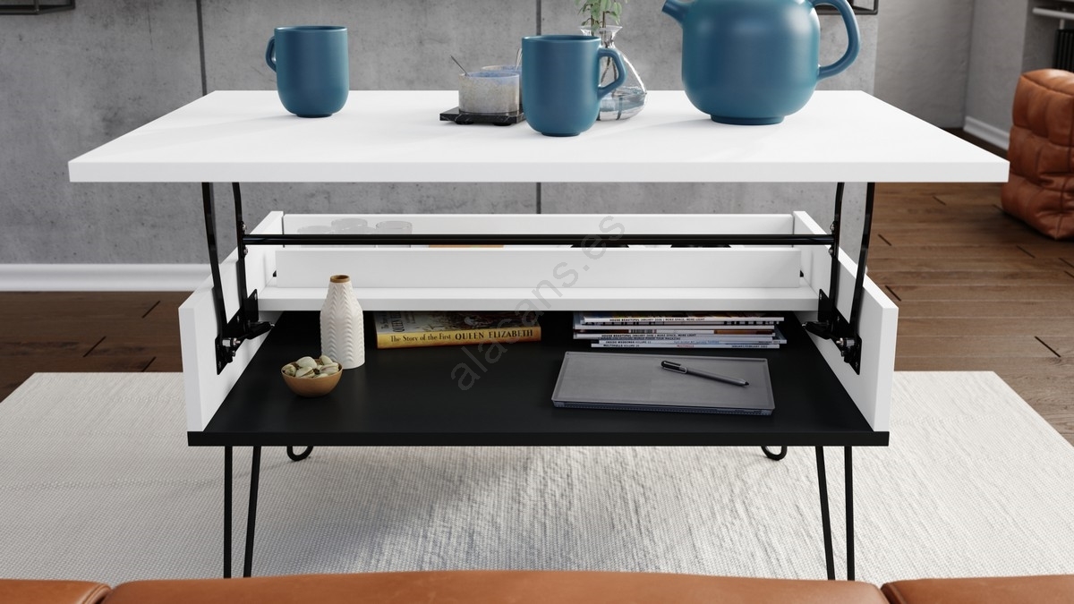 • Mesa de centro con tapa elevable y balda HALIJA blanca/negra