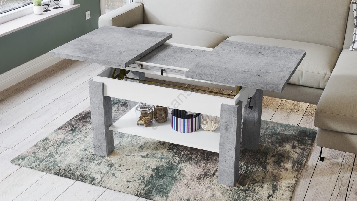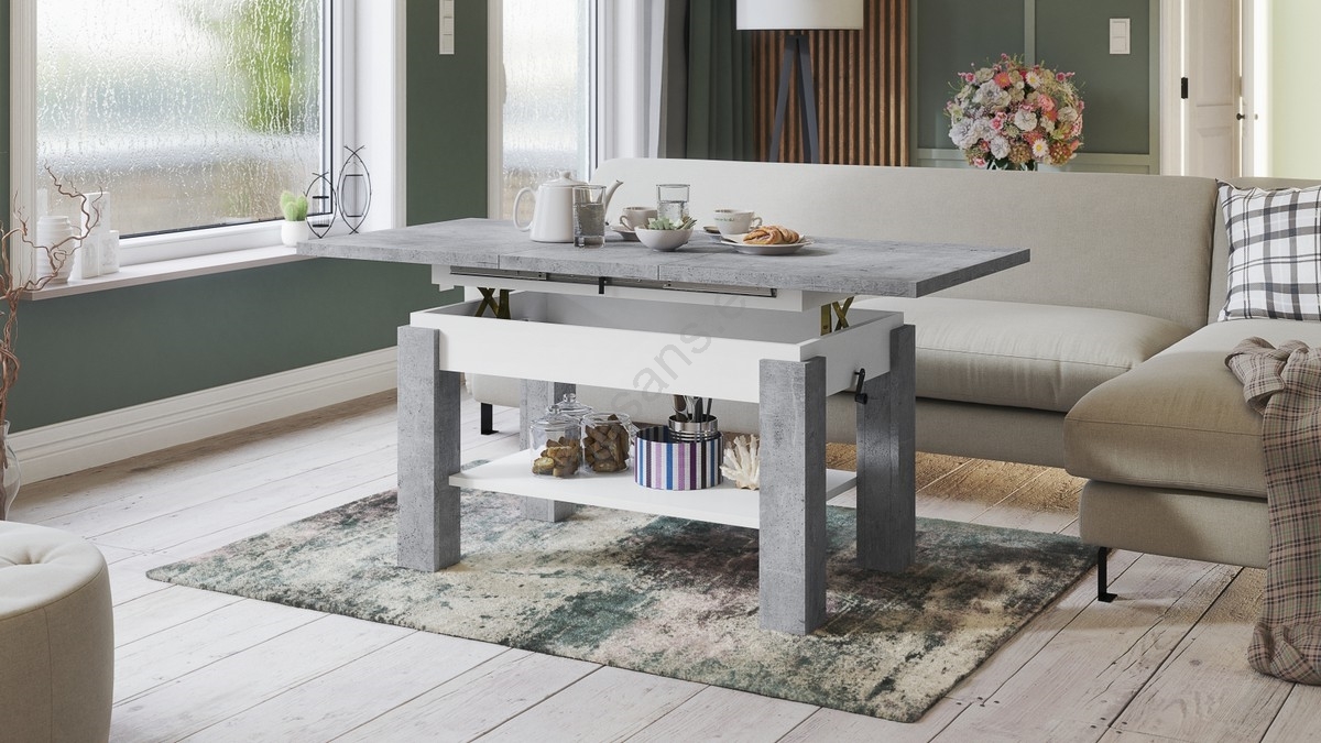 • Mesa de centro extensible con balda ADONIS 110/150x68 cm gris hormigón/blanco