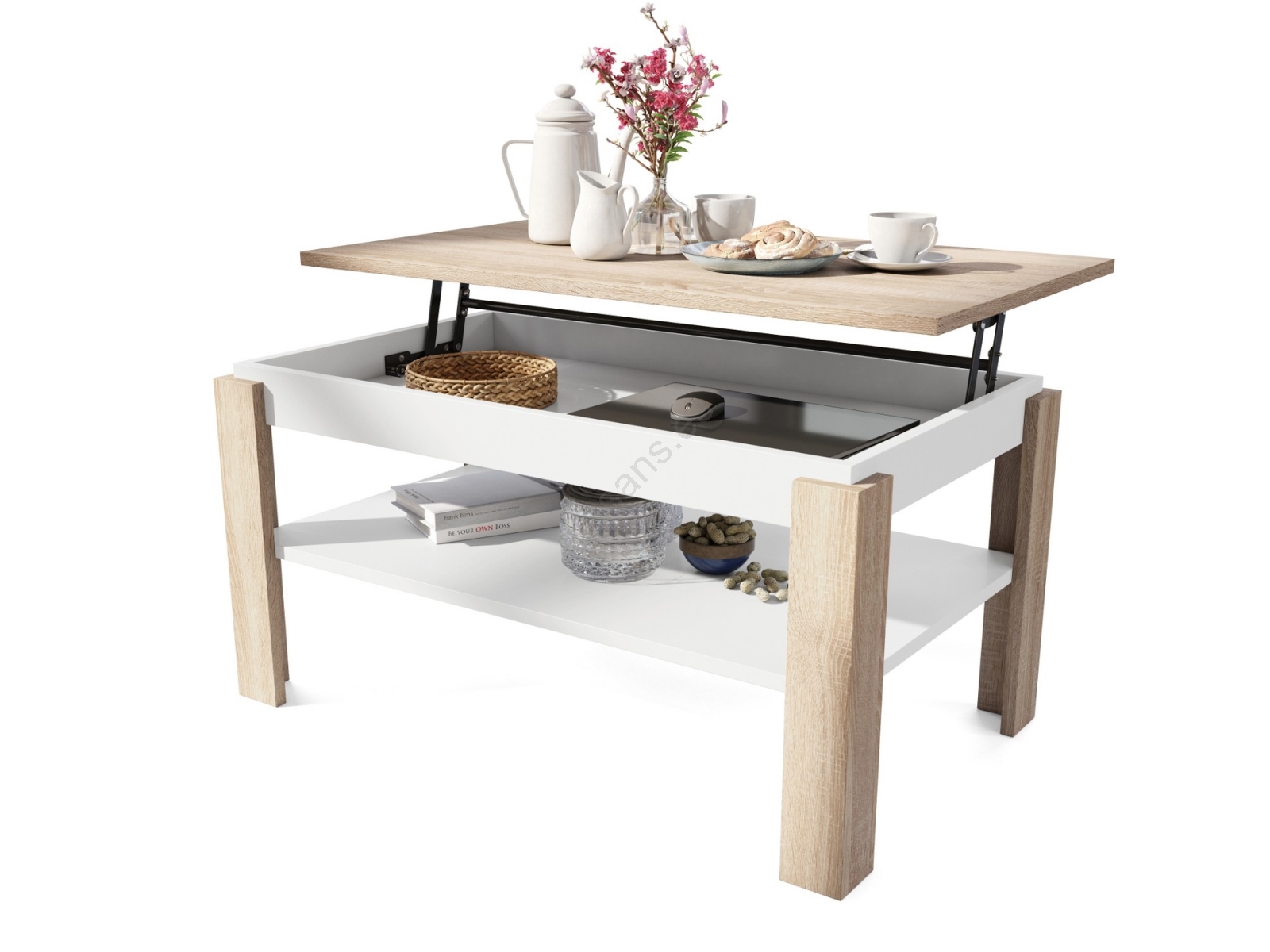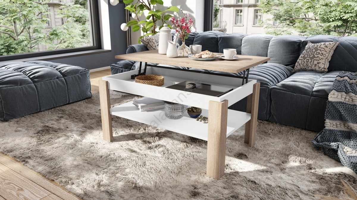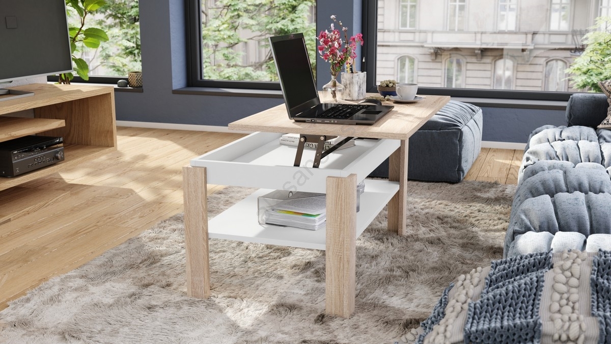 • Mesa de centro extensible con tablero elevable y balda ADEN, roble Sonoma/blanco