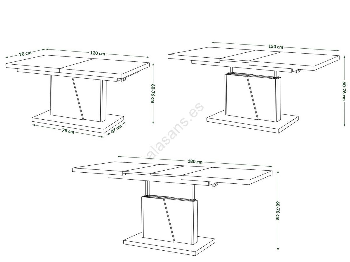 • Gracias a dos extensiones de 30 cm, el tablero de la mesa se puede ampliar a 150 o 180 cm.