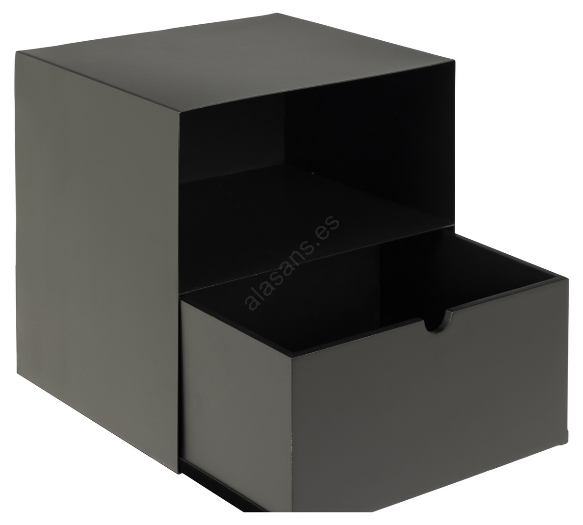 • Tablero superior y marco de acero con recubrimiento en polvo negro mate de textura rugosa, cajón negro con compartimento abierto y sistema de montaje en pared.