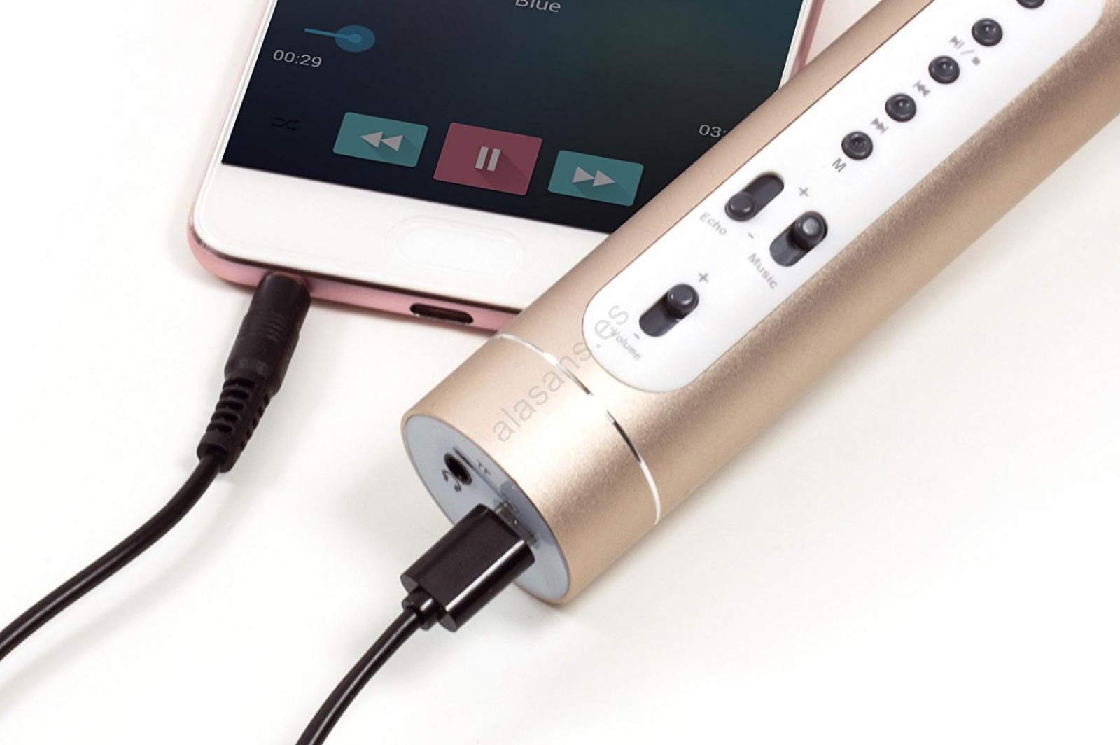 • Conector AUX: enchufa un extremo del cable en la entrada AUX y la otra punta USB en el móvil, tablet, PC o reproductor MP3, y el micrófono reproducirá la música que selecciones en el dispositivo conectado.