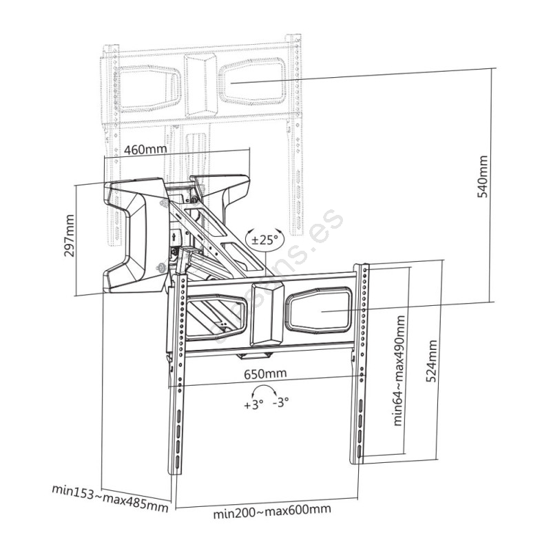 • Movimiento vertical de la TV (arriba/abajo) en un rango de 540 mm, con una distancia respecto a la pared de 153 - 485 mm.