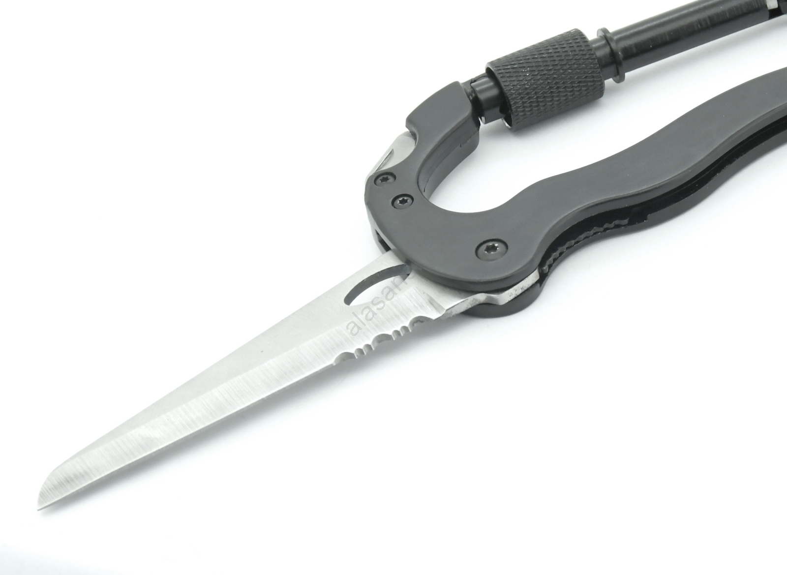• El mosquetón incluye un cuchillo de 7,5 cm con hoja dentada.