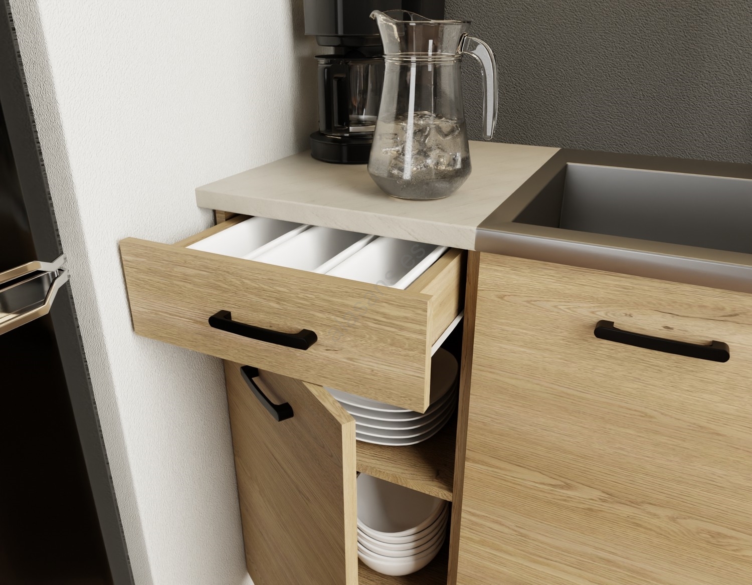 • Distribución de los armarios es modular, puede adaptar la cocina según sus propias preferencias.