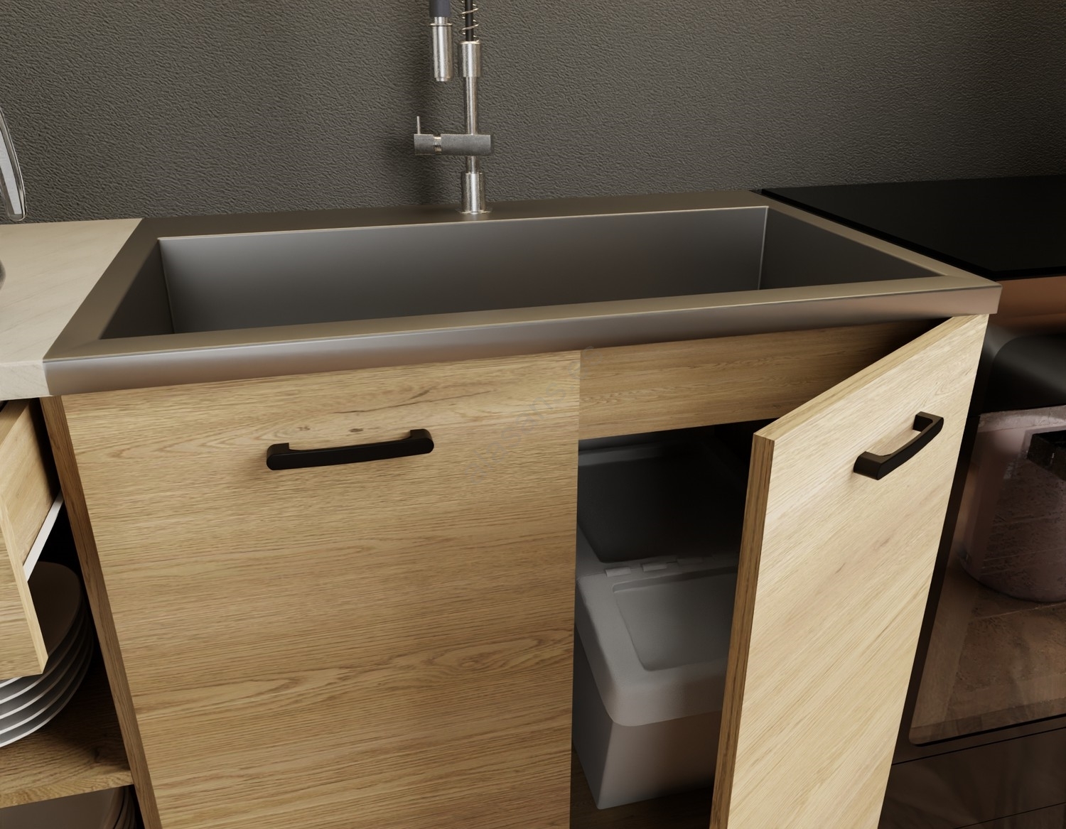 • No incluye electrodomésticos, fregadero, grifo de cocina ni encimera superior.