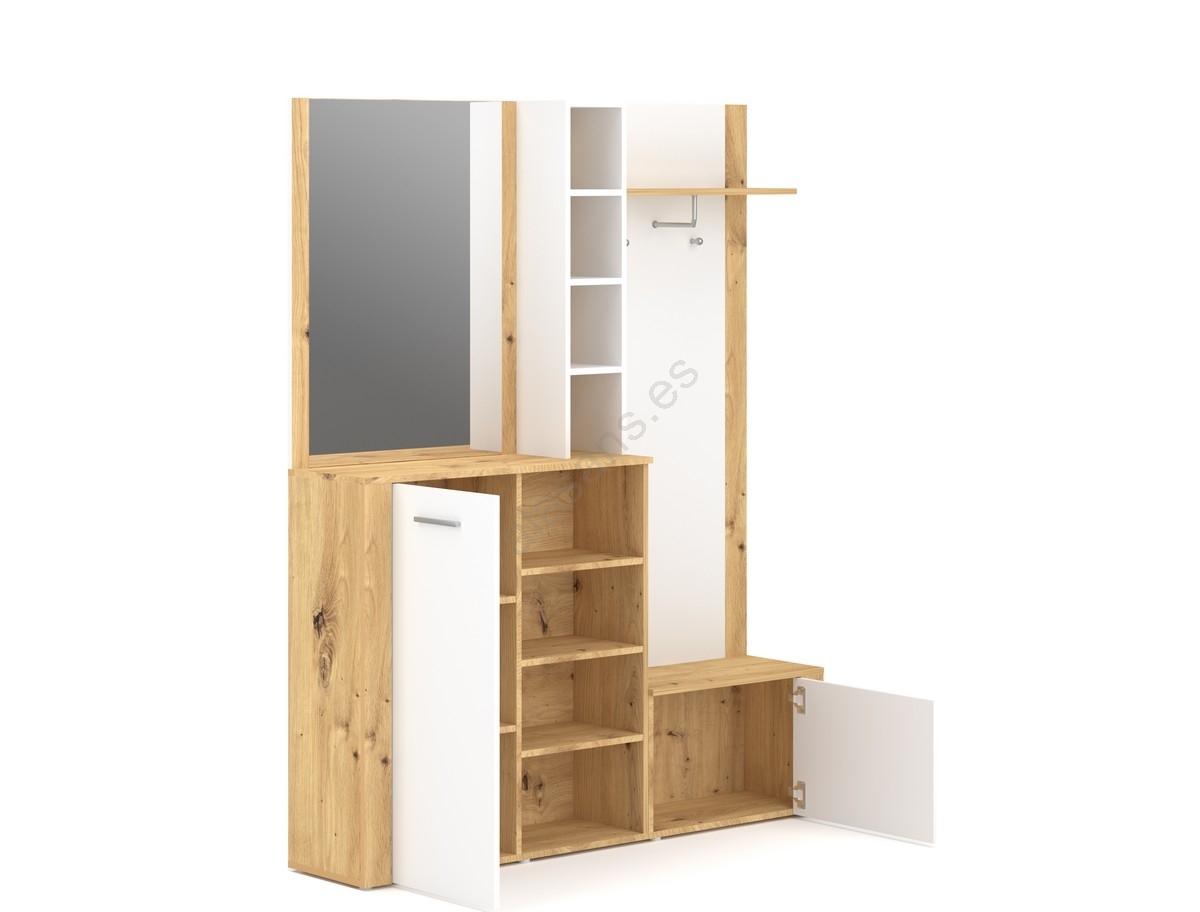 • Estantes abiertos, ganchos, barra para abrigos y un gran espejo ofrecen exactamente lo que necesita.