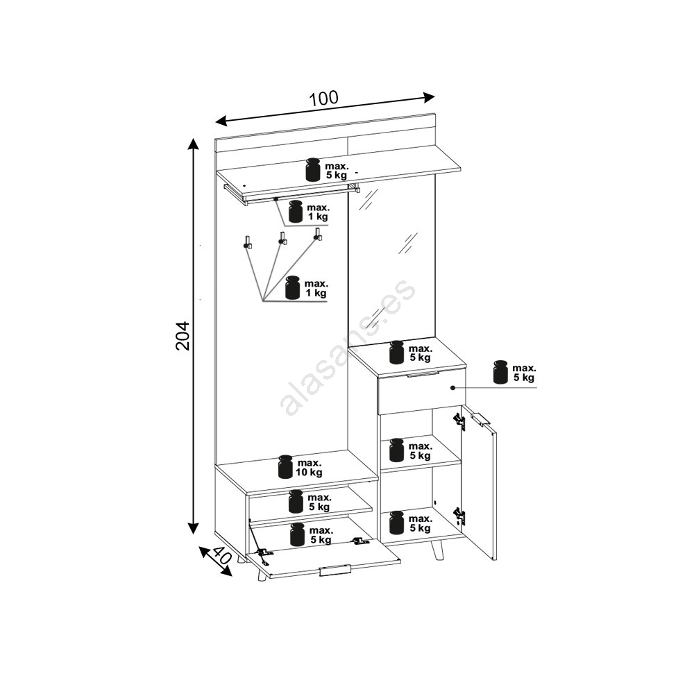 • Estantes, ganchos, barra para abrigos y un gran espejo ofrecen justo lo que necesitas.