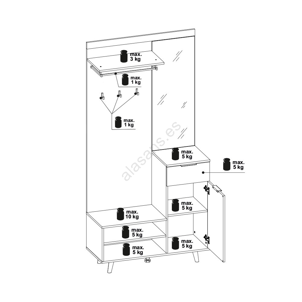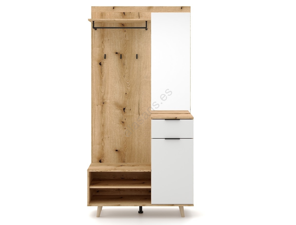 • Estantes abiertos, ganchos, barra para abrigos y un gran espejo ofrecen exactamente lo que necesitas.