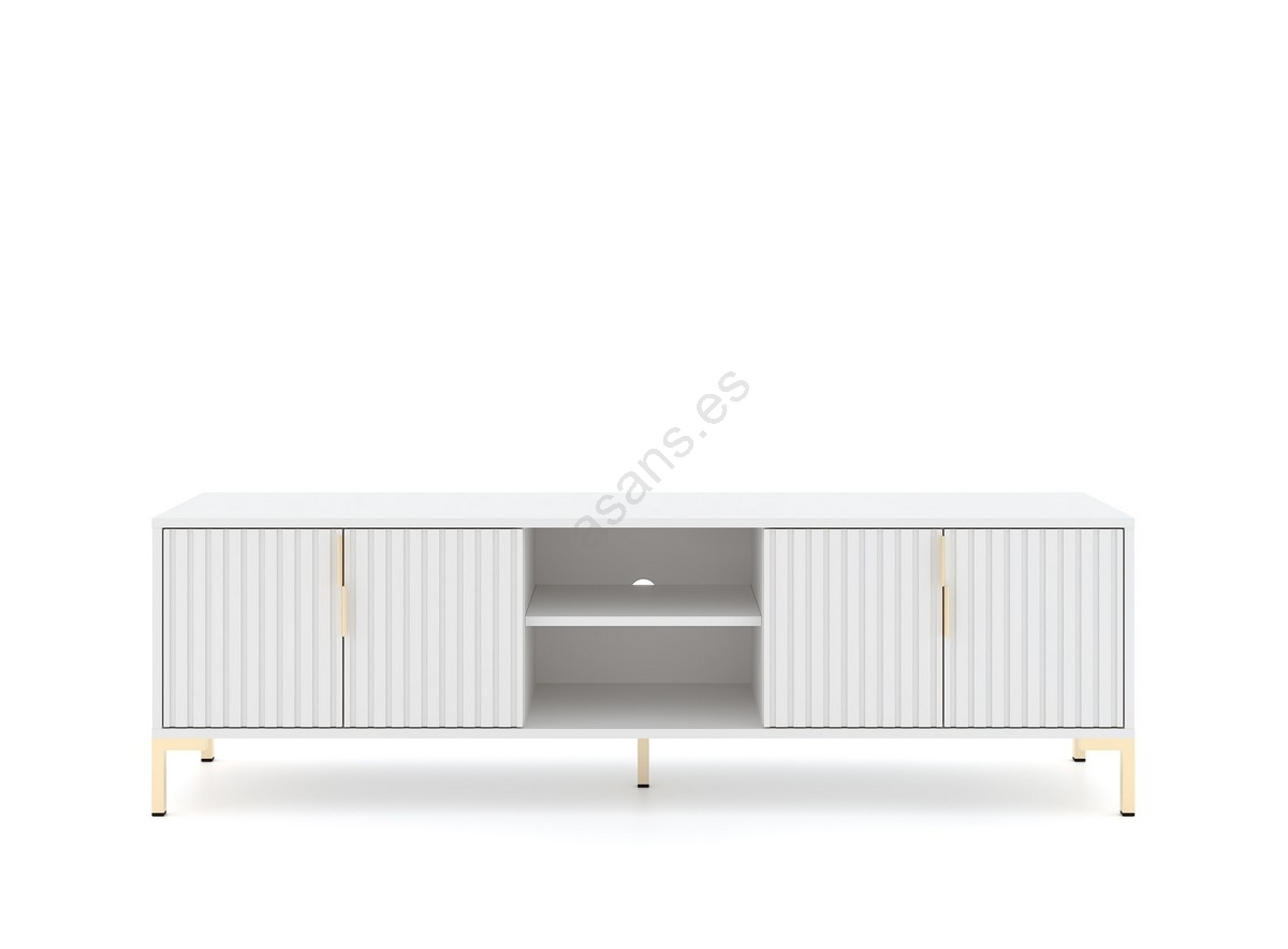 • Cuenta con dos compartimentos laterales cerrados, cada uno con dos puertas con tiradores simétricos y acabado acanalado, y dos estantes abiertos con un orificio para cables en el centro.