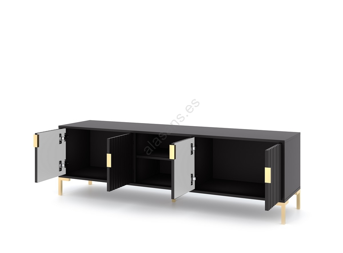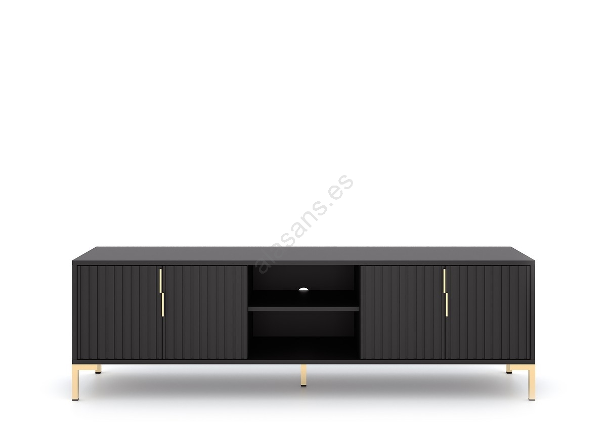 • Dispone de dos compartimentos laterales cerrados, cada uno con dos puertas con tiradores simétricos y acabado acanalado, y dos estantes abiertos con orificio para cables en el centro.
