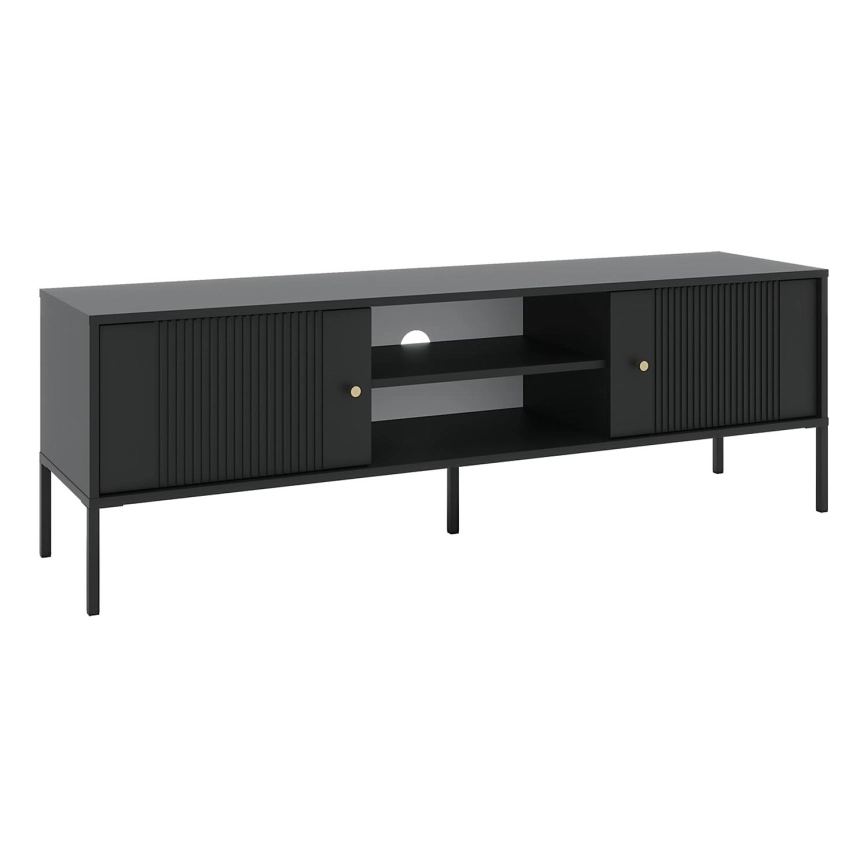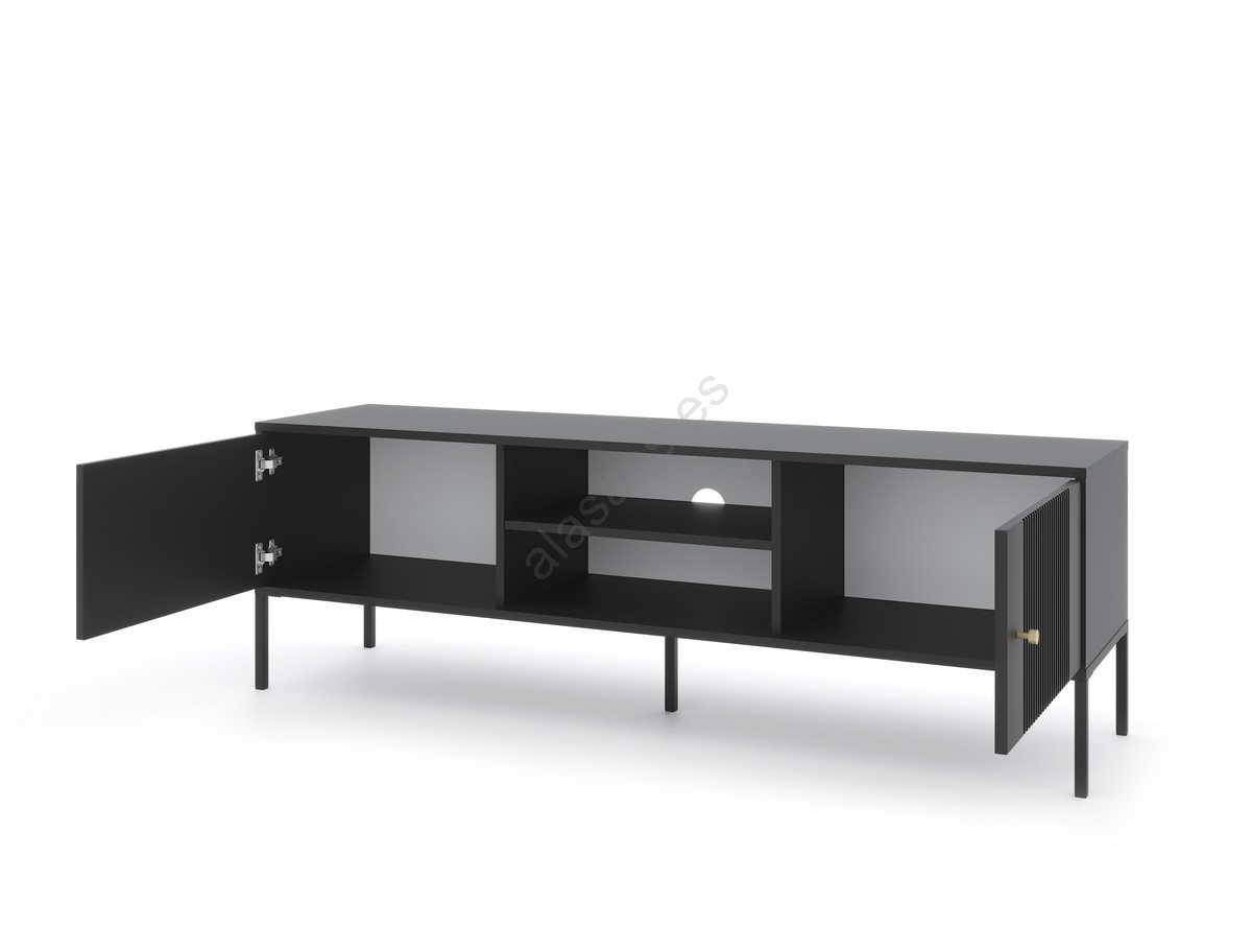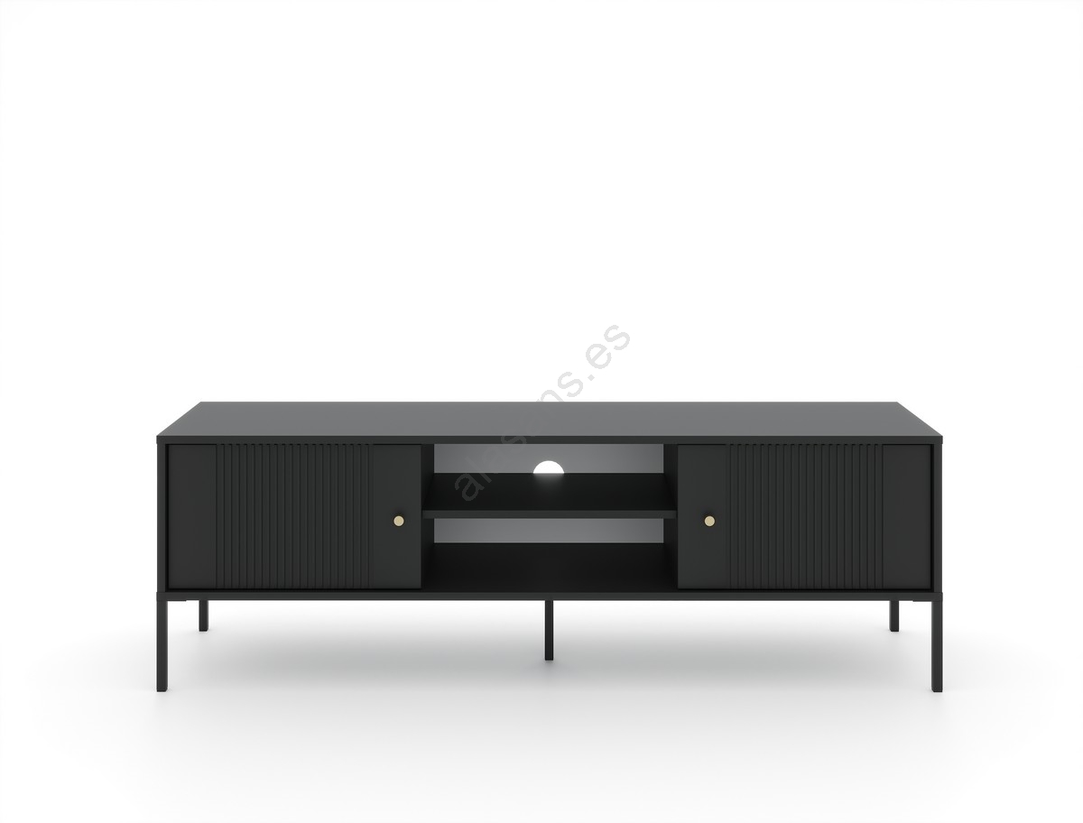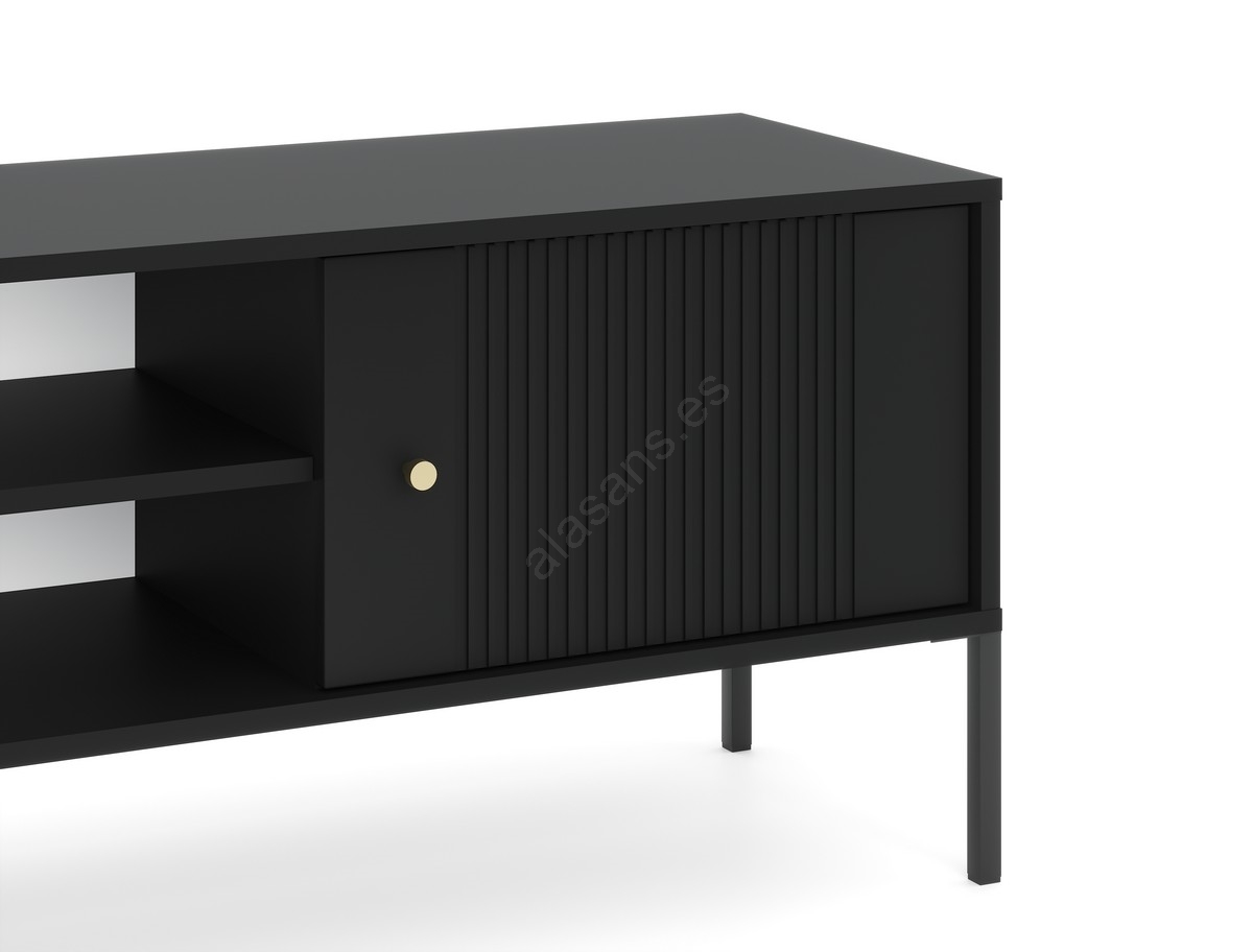 • Cuenta con dos compartimentos laterales cerrados con paneles acanalados y dos estantes abiertos, uno con orificio para cables en el centro.