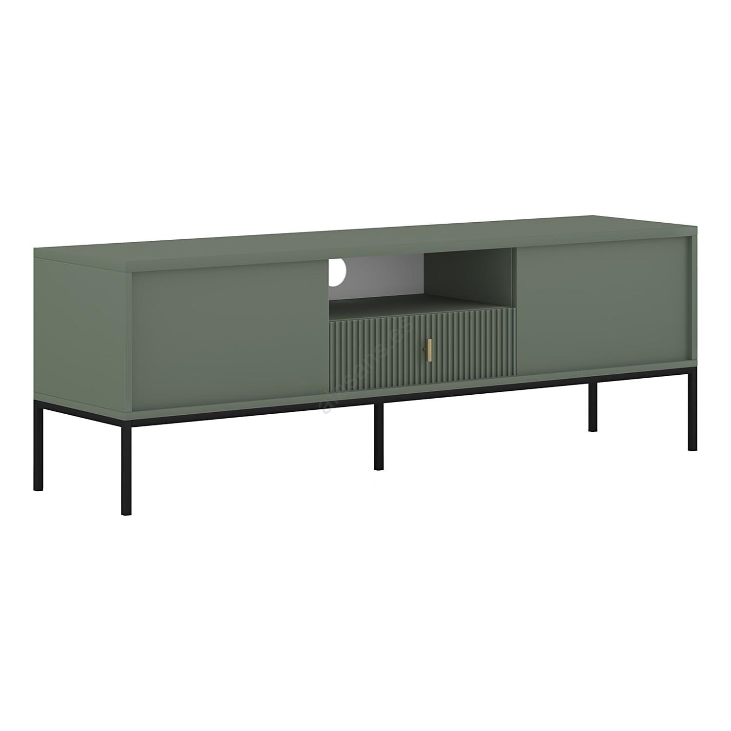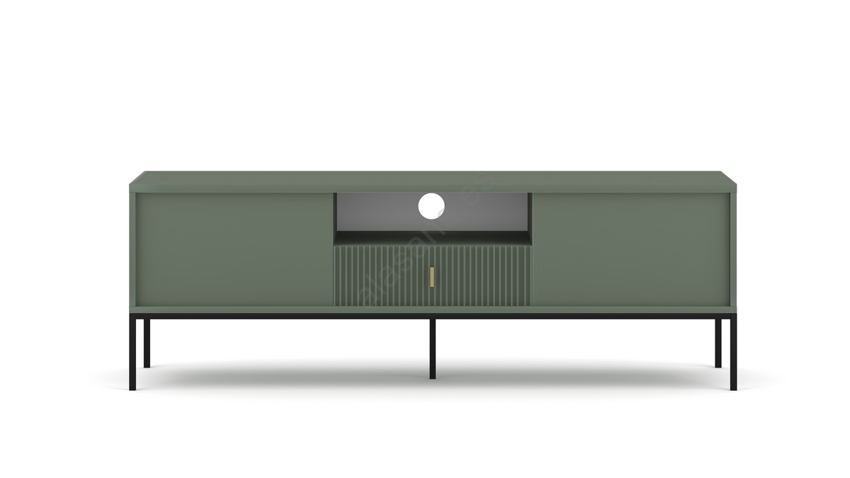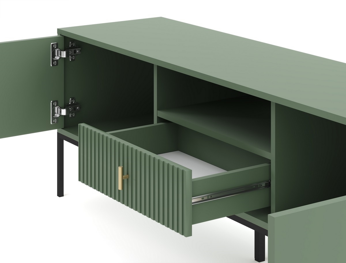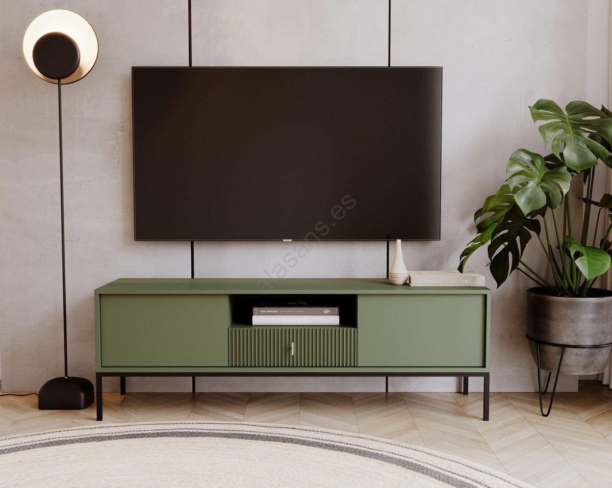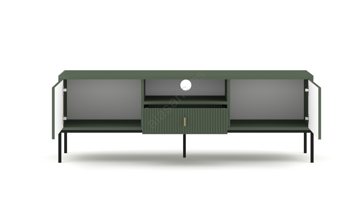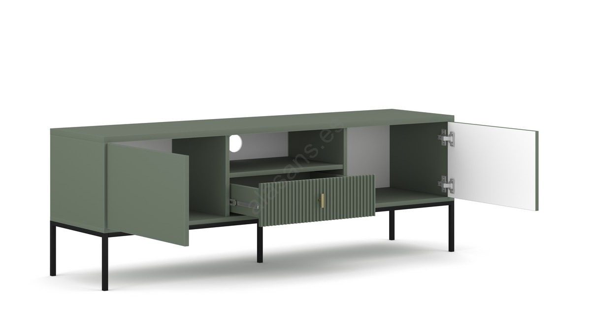 • Cuenta con dos compartimentos laterales cerrados, una balda abierta con orificio para cables en el centro y un cajón bajo la balda con acanalado.