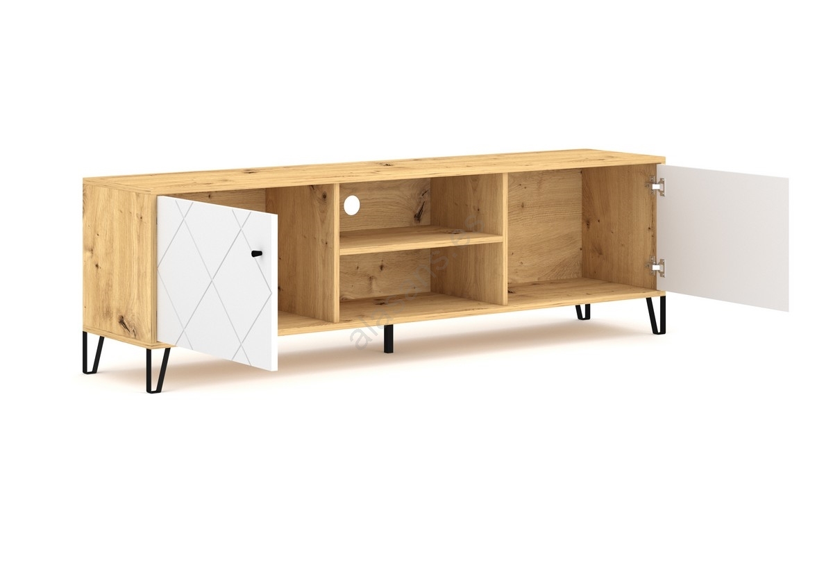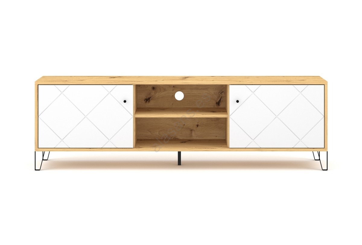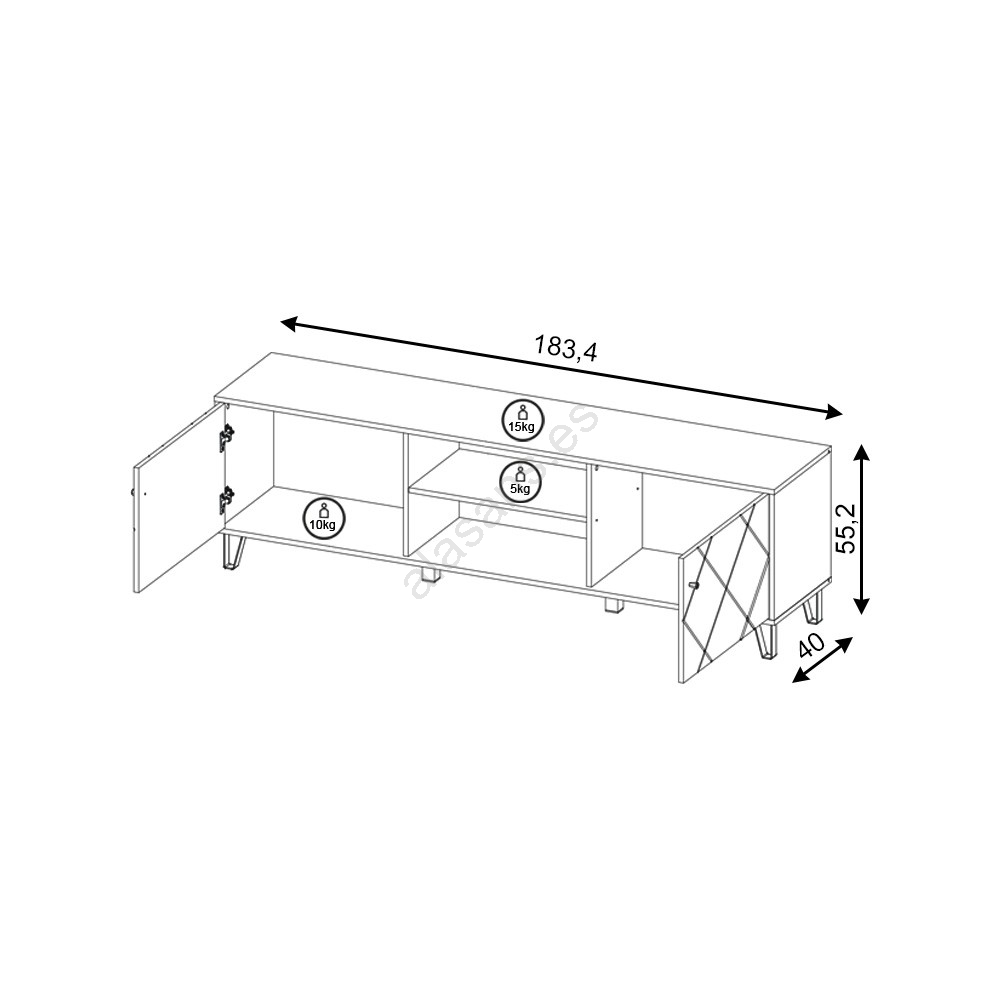 • Cuenta con dos compartimentos laterales cerrados, cada uno con una puerta con acabado decorativo diagonal, y dos estantes abiertos en el centro con pasacables.