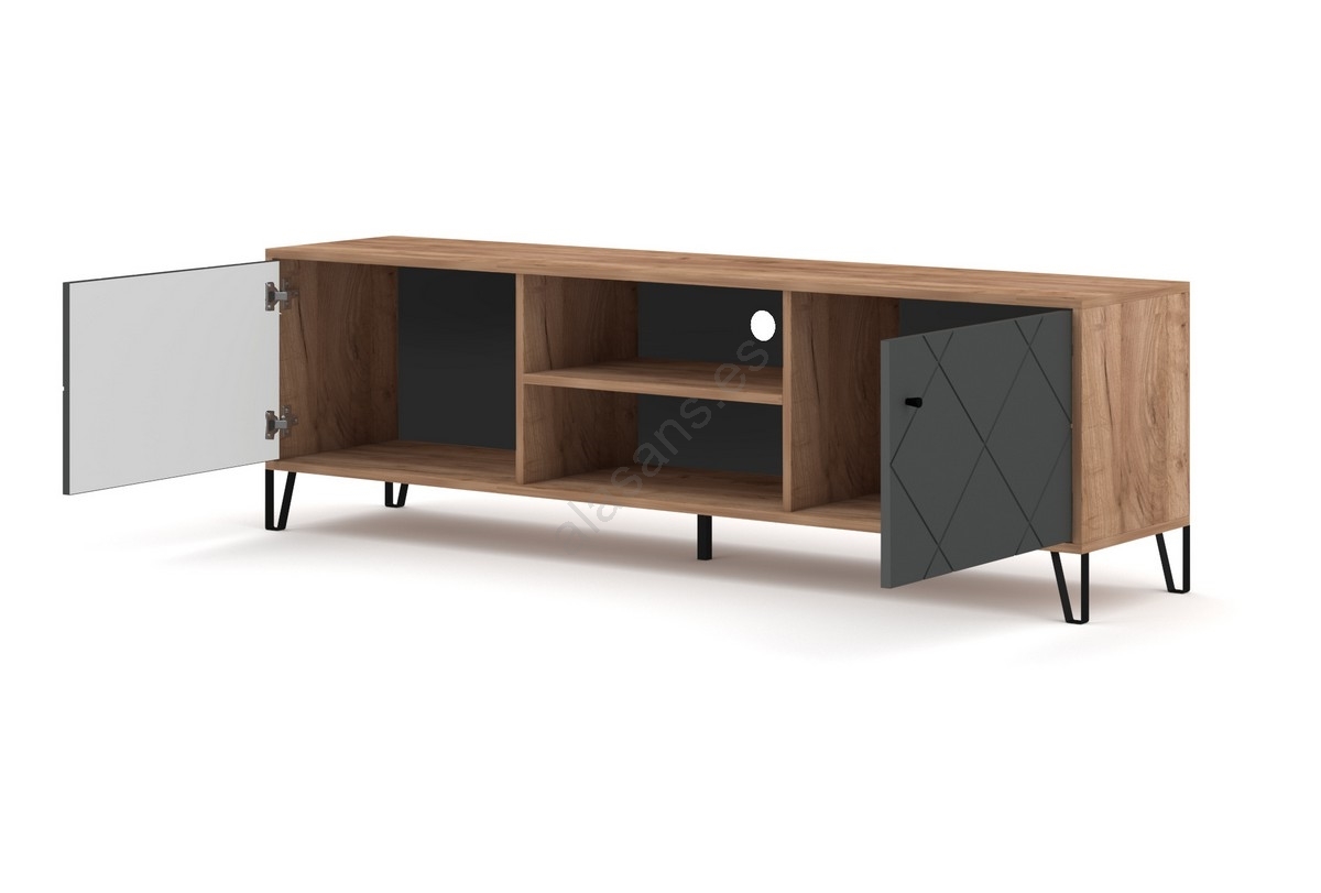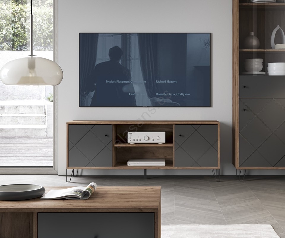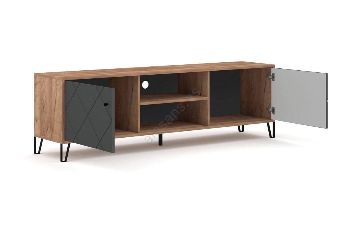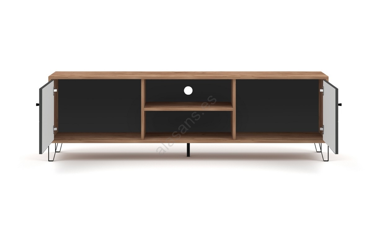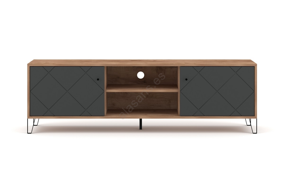 • Dispone de dos compartimentos laterales cerrados, cada uno con puertas con un detalle decorativo diagonal, y dos estantes abiertos con un pasacables en la parte central.