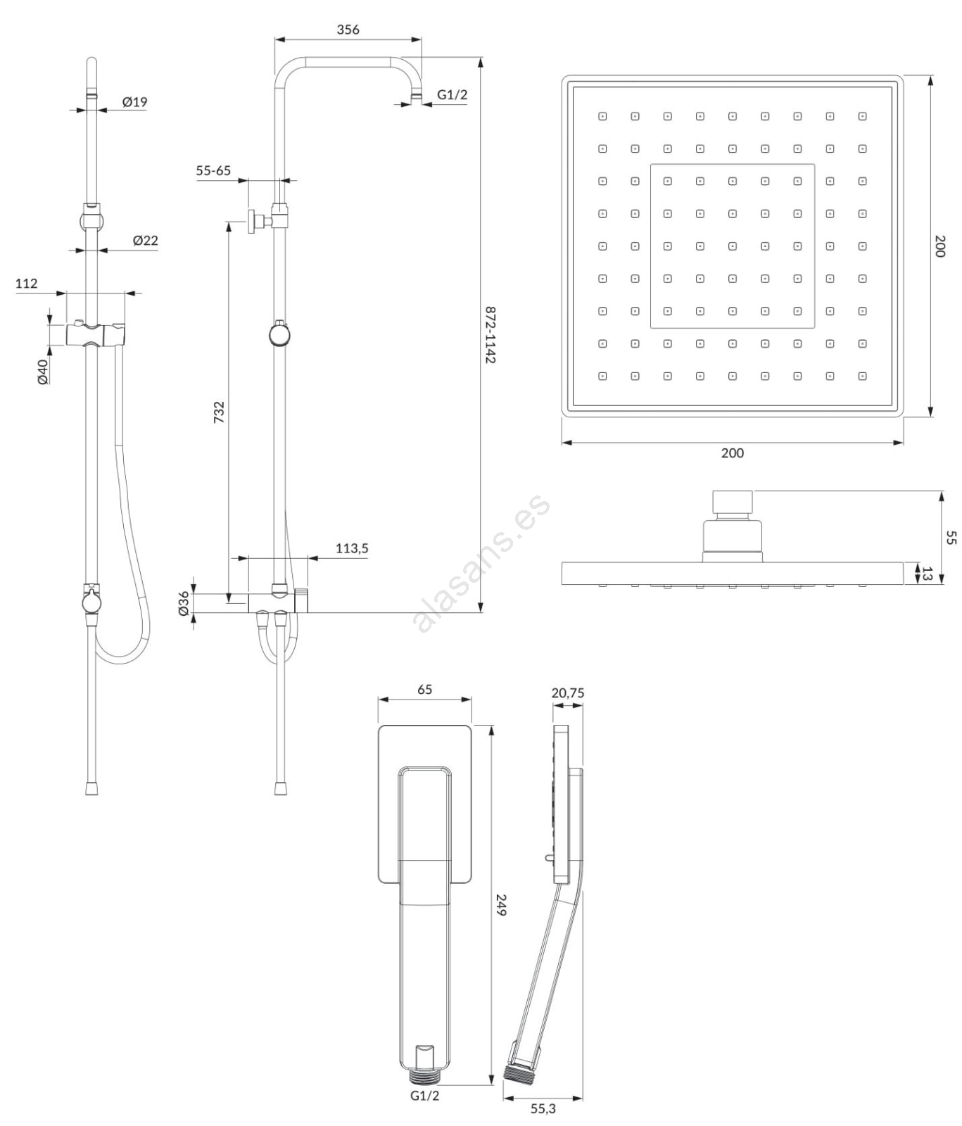 • El conjunto incluye: cabeza de ducha de latón, ducha de mano de latón (3 funciones), manguera de ducha de acero inoxidable, brazo giratorio de latón, barra de ducha de latón, soporte de ducha de mano de latón, columna de ducha con interruptor y brazo de la cabeza de ducha.