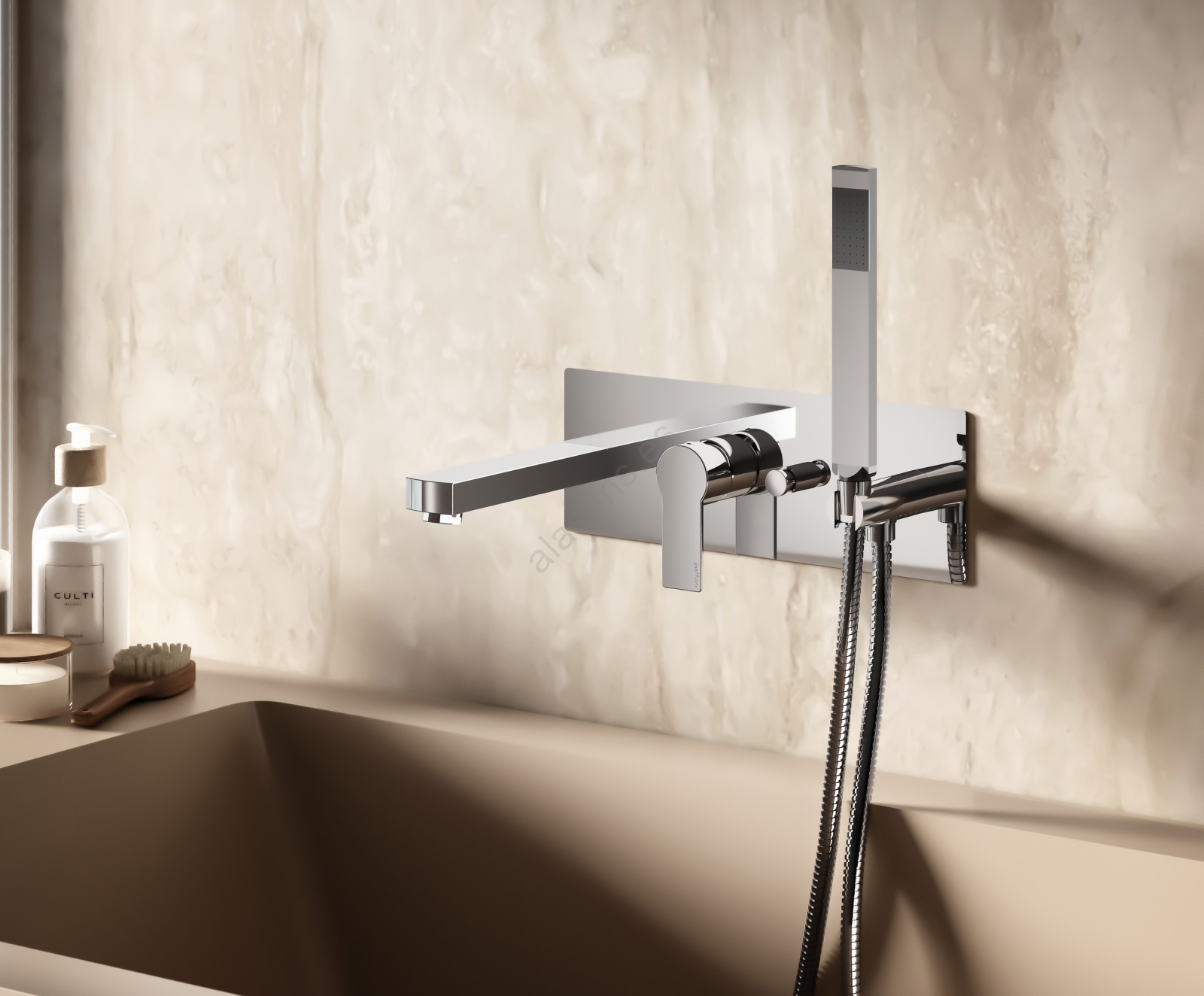 • Mezclador monomando empotrado para bañera con diseño moderno y de líneas angulosas.