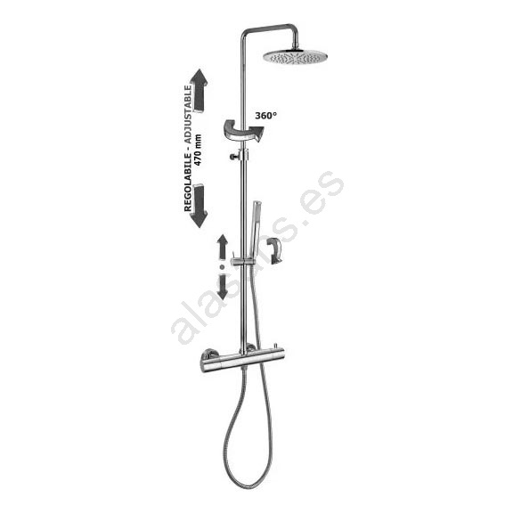 • Set de ducha mural con grifo termostático que garantiza una temperatura del agua estable y segura.