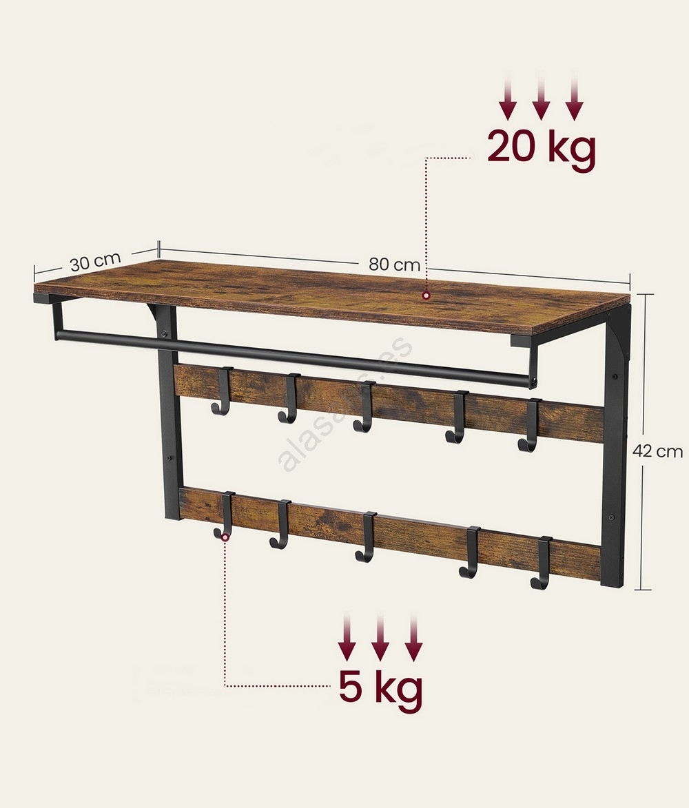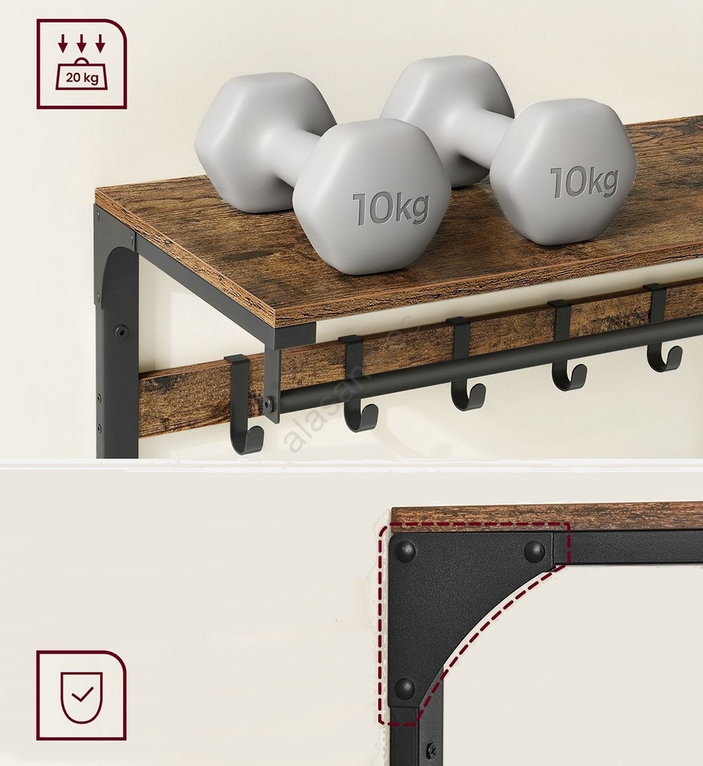 • Tiene una capacidad máxima de 20 kg para la balda, 5 kg por cada gancho y 15 kg para la barra (la capacidad máxima total del perchero es de 45 kg).